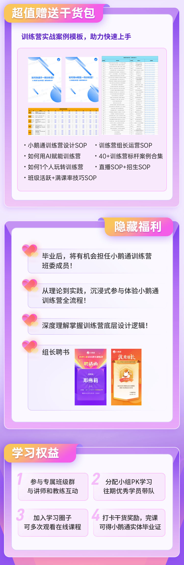 毕业后,将有机会担任小鹅通训练营班委成员!从理论到实践,沉浸式参与体验小鹅通训练营全流程!深度理解掌握训练营底层设计逻辑!