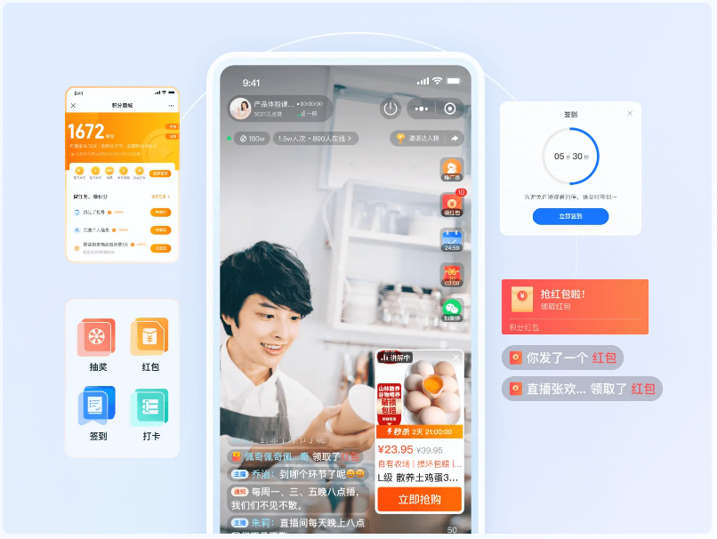 小鹅通提供了门店红包、客户积分、优惠券、礼品券等多种营销工具,帮你提升直播间热度与氛围,促进转化。