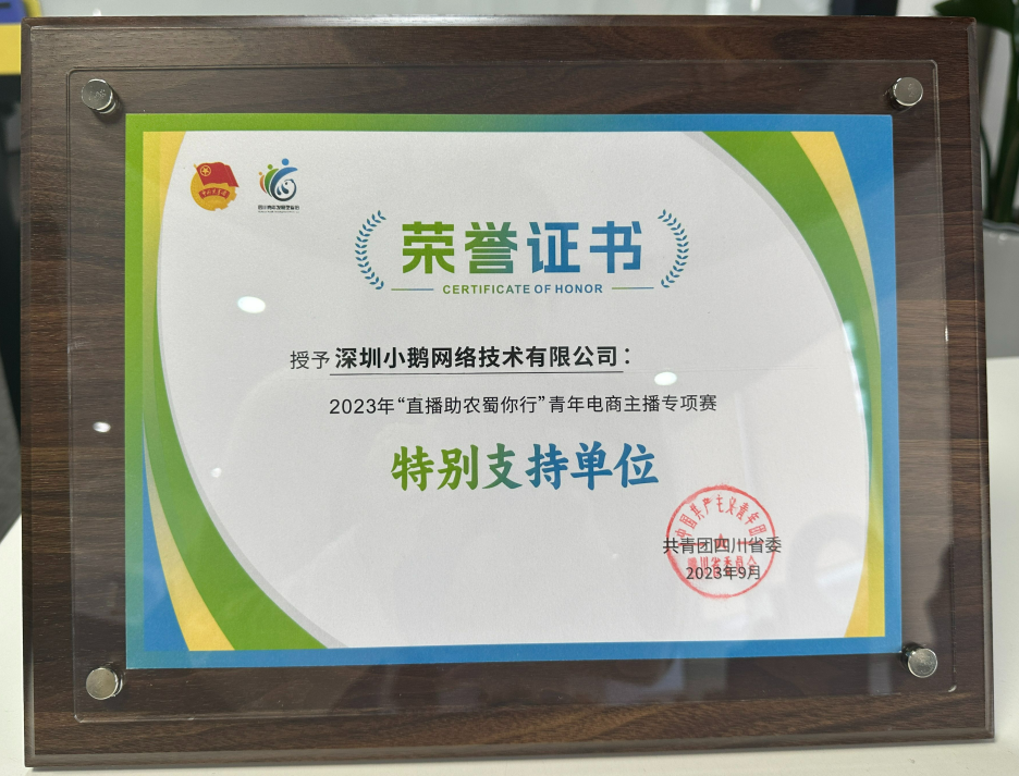 近日,小鹅通荣获共青团四川省委等部门联合颁发的2023年“直播助农蜀你行”青年电商主播专项赛特别支持单位奖项!