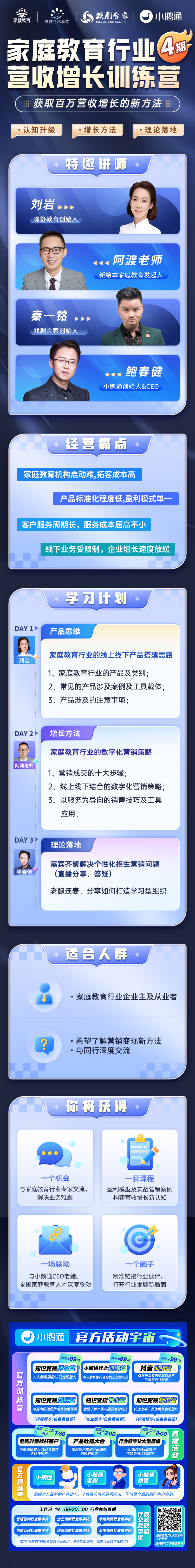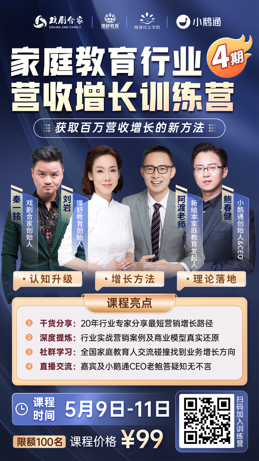 我们结合小鹅通许多优秀的家庭教育行业客户案例,还有多名头部IP访谈调研,特别定制了「家庭教育行业营收增长训练营」。