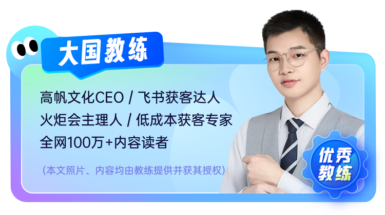 六年创业路,大国教练从运营圈切入AI赛道,靠飞书文档十万+爆款内容沉淀私域,打造“内容+服务”双驱动模式,To B与To C业务并行,年营收达数百万,用实战项目和深度服务在AI浪潮中实现可持续获客。
