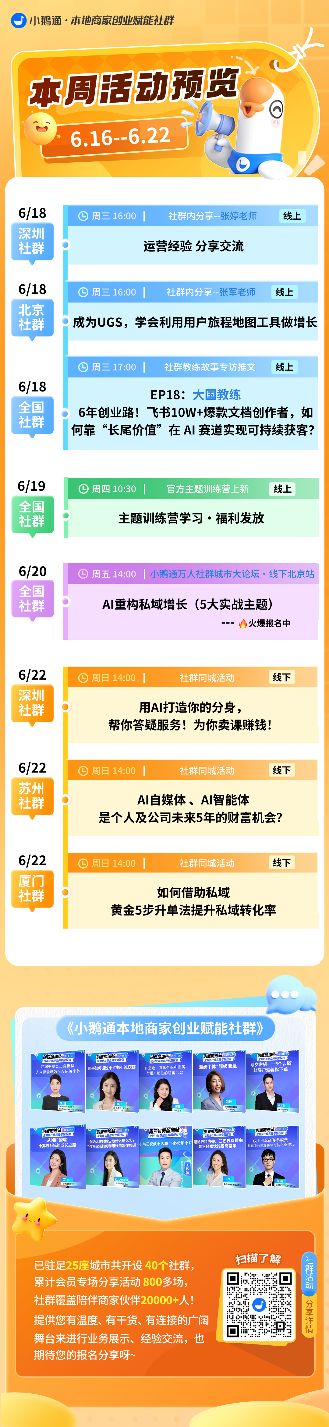 👉想了解更多投流获客实战经验?【小鹅通本地商家创业赋能社群】本周活动详情来啦~每一期都是精心筹备的经验分享专场!