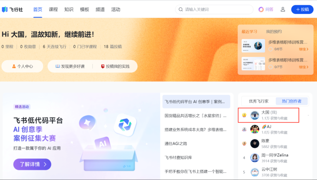 我的获客路径比较特殊:我没有小红书、视频号、抖音这些公域平台。从一开始,我的核心阵地就是 飞书文档 。我是飞书平台上的创作者,属于他们的“飞行社”社区,并且我在这个社区的创作者排名是第一,可以说,我是靠在飞书文档上做内容创作起家的。