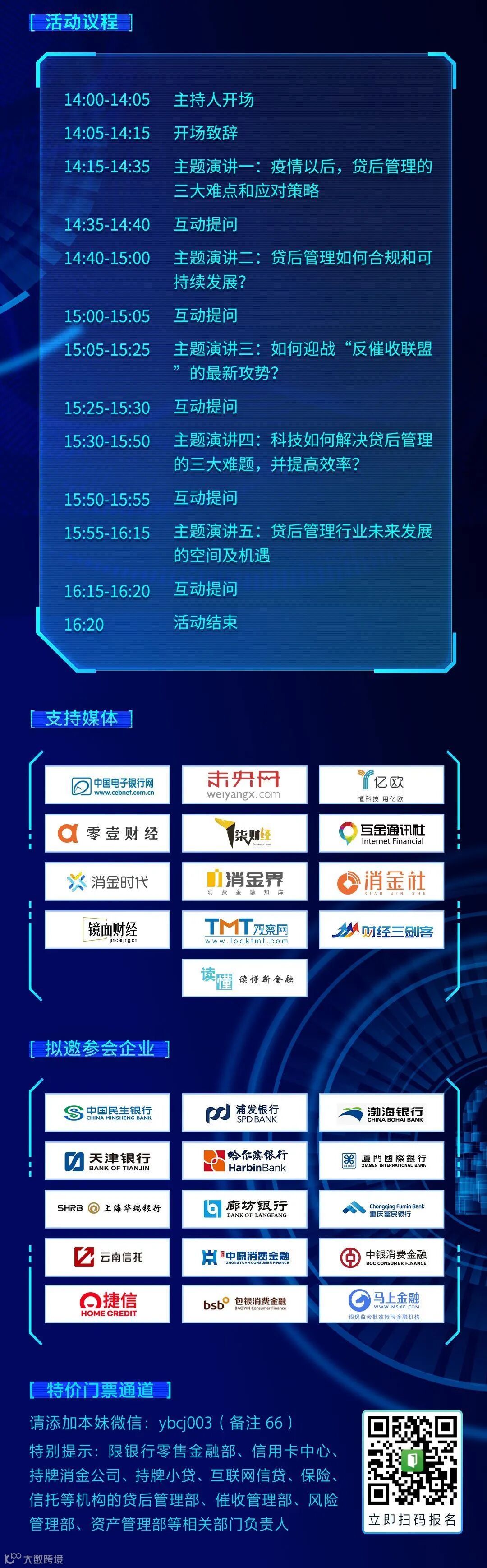 本场峰会采用直播形式,有5个主题演讲。与会嘉宾将针对“贷后管理的三大难点和应对策略”“合规贷后管理”“‘反催收联盟’的最新攻势”等主题,进行深度探讨。每场主题演讲都设有提问环节。