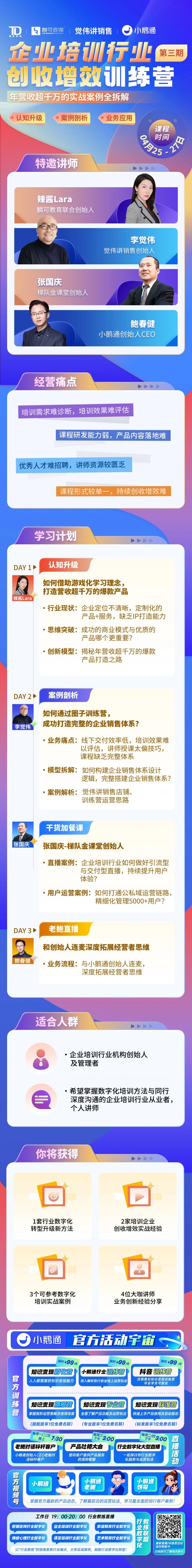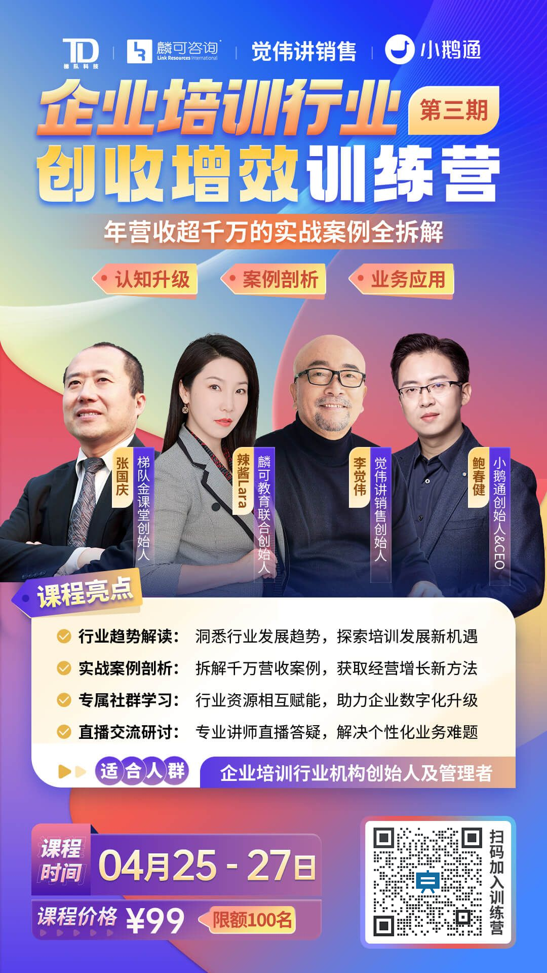 我们结合小鹅通许多优秀的企业培训行业客户案例,还有多名头部IP访谈调研,特别定制了「企业培训行业创收增效训练营」。