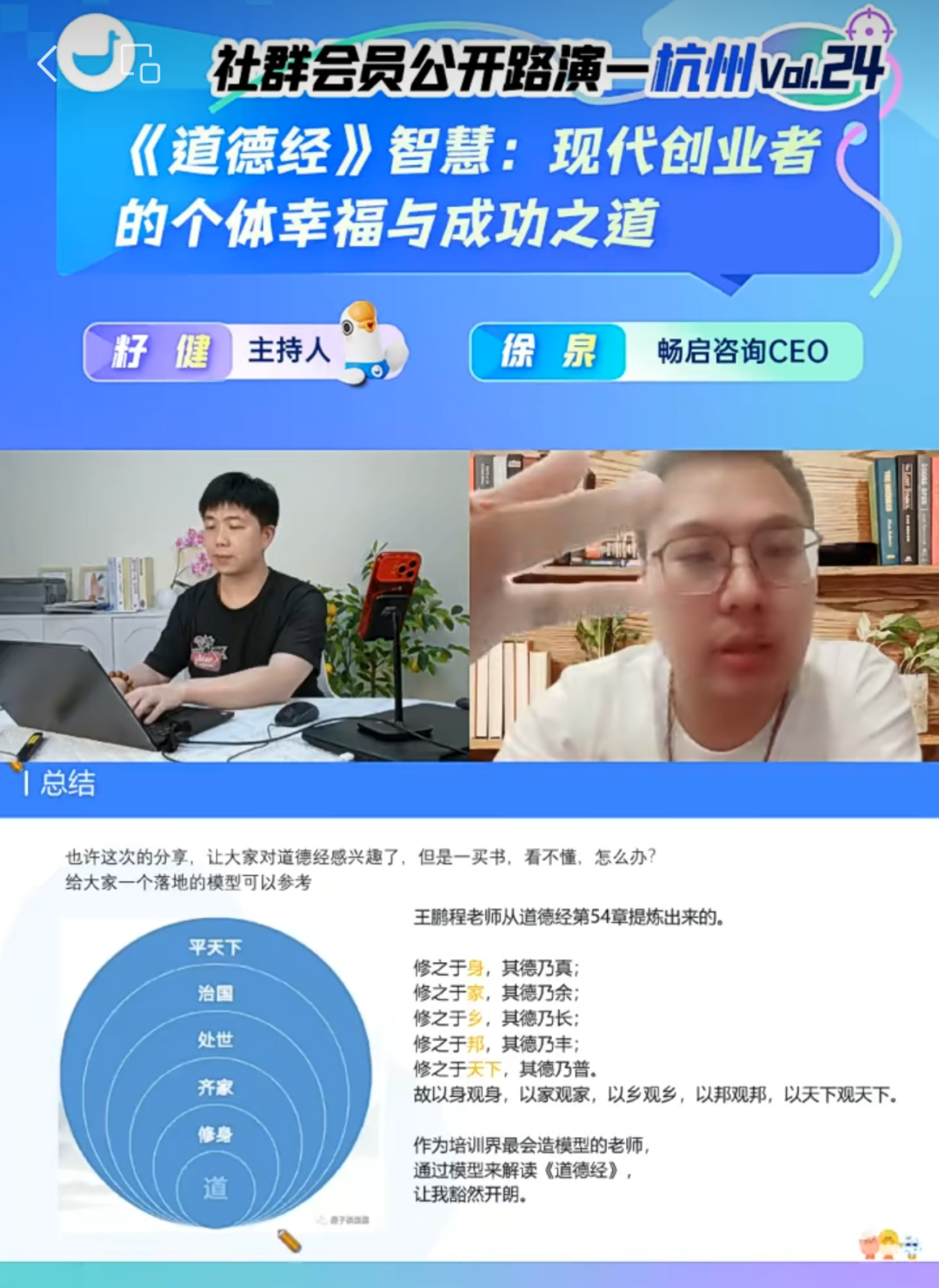 我的分享主题是:《道德经智慧,现代创业者的个体幸福与成功之道》,一共31页ppt,分享了一个半小时。
