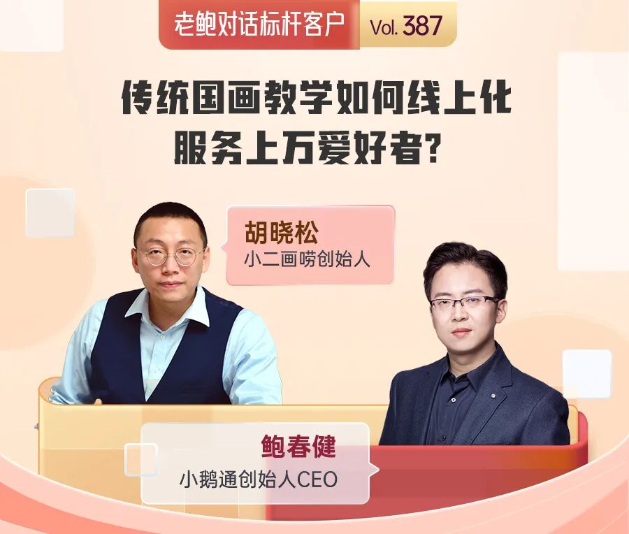 客户介绍:老鲍对话标杆第387期,邀请了小二画唠创始人——胡晓松老师。小二画唠于2017年创立,主要做中国画的承传和普及。