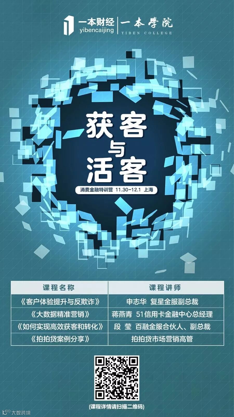 下周五(11月30日),一本学院“消费金融获客与活客特训营”,特邀多位顶级实战专家授课,带您走进行业标杆企业,破解营销获客和客户激活的关键环节和难题。