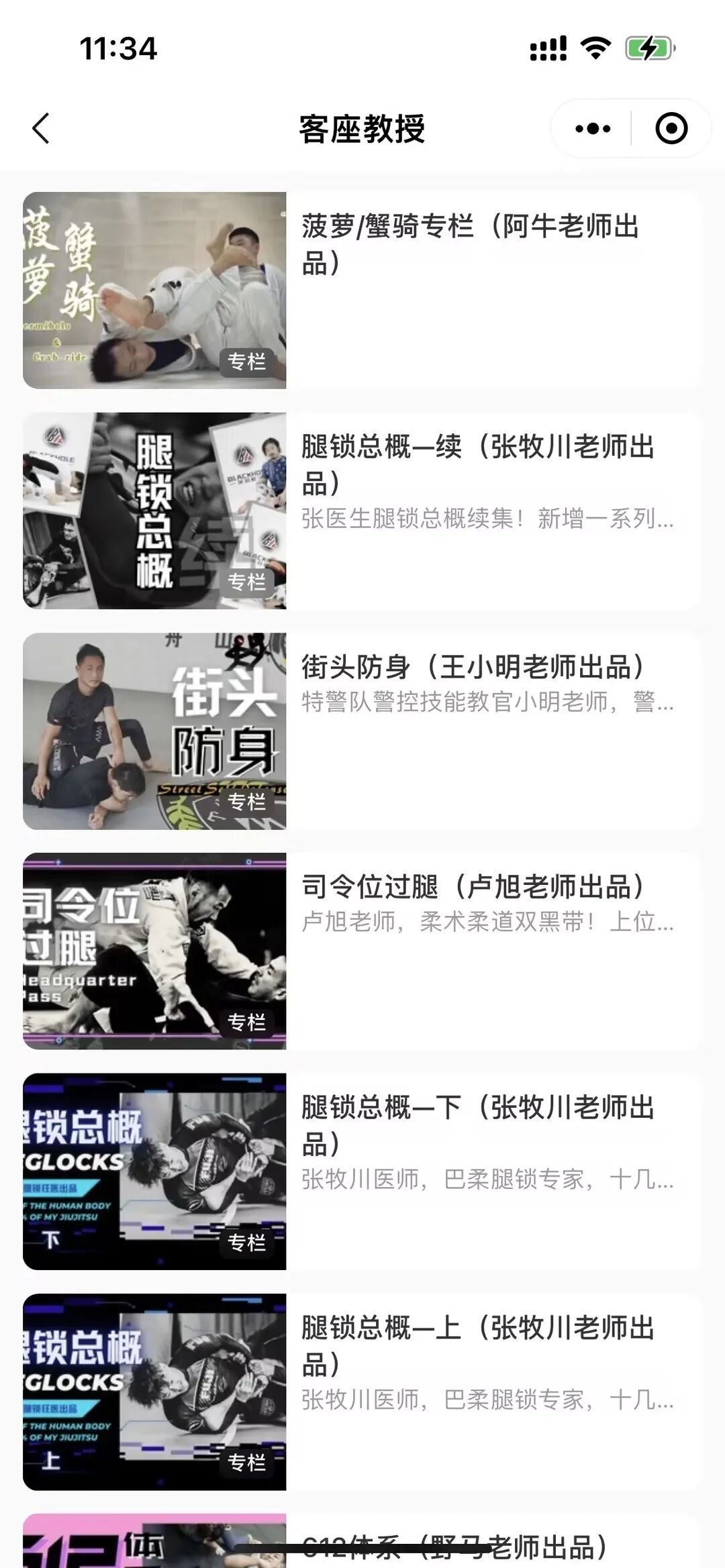 不仅如此,为了丰富教学内容维度,打造国内的“线上道场平台”,「星辰柔术」还在其小鹅通店铺内专门开设了“客座教授”栏目,由更多外部的黑带老师来参与到内容教学中。