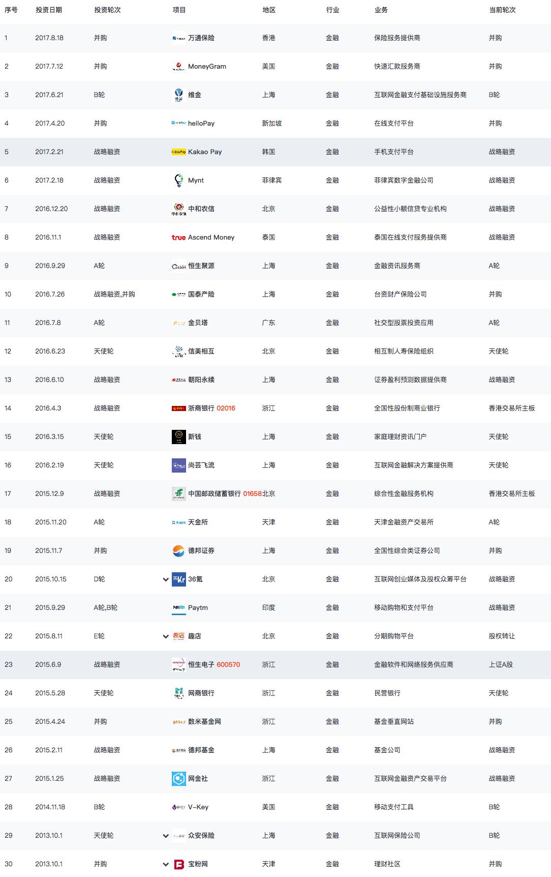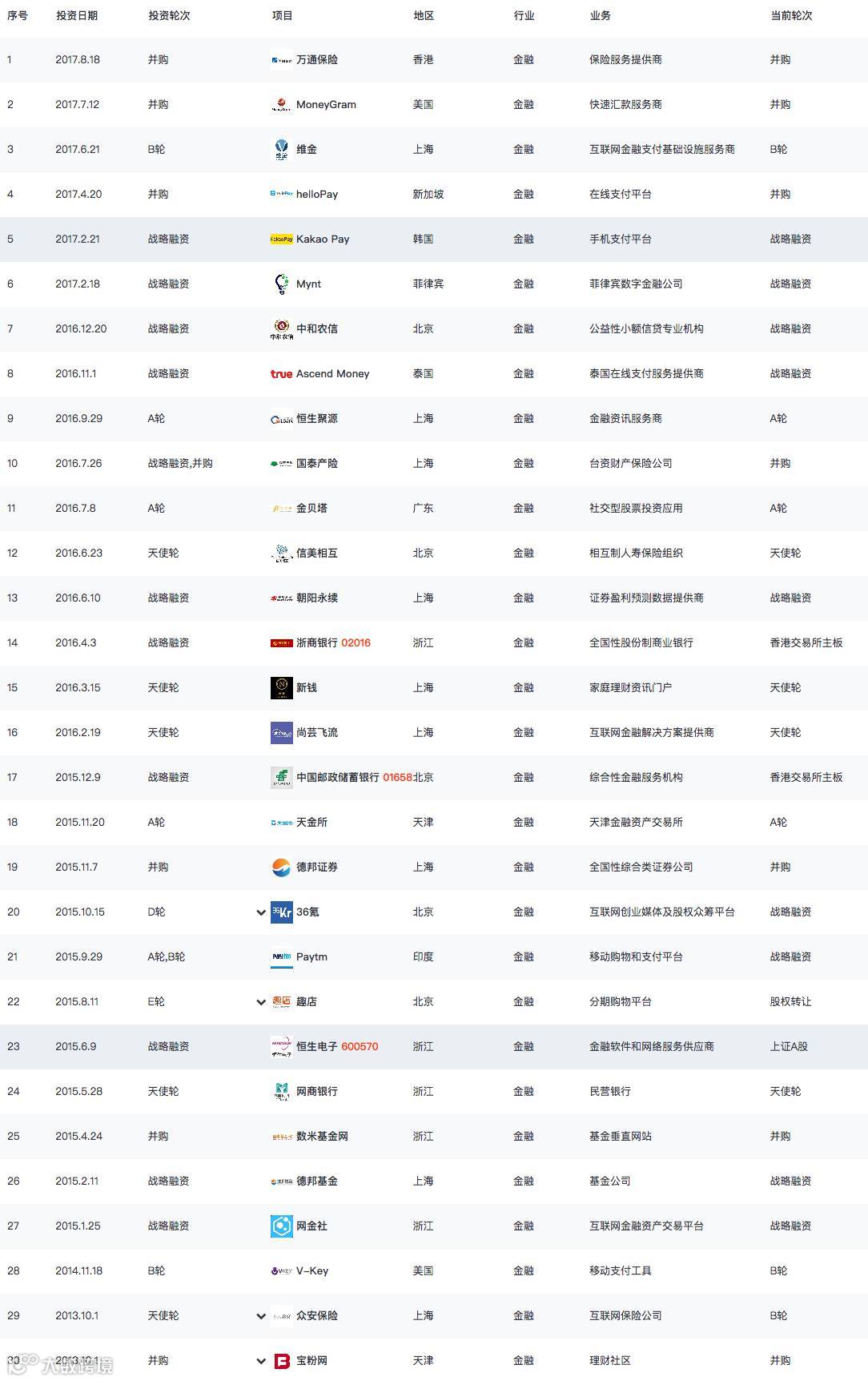 截止目前,蚂蚁金服一共投资、并购了60家初创公司,其中金融领域33家。