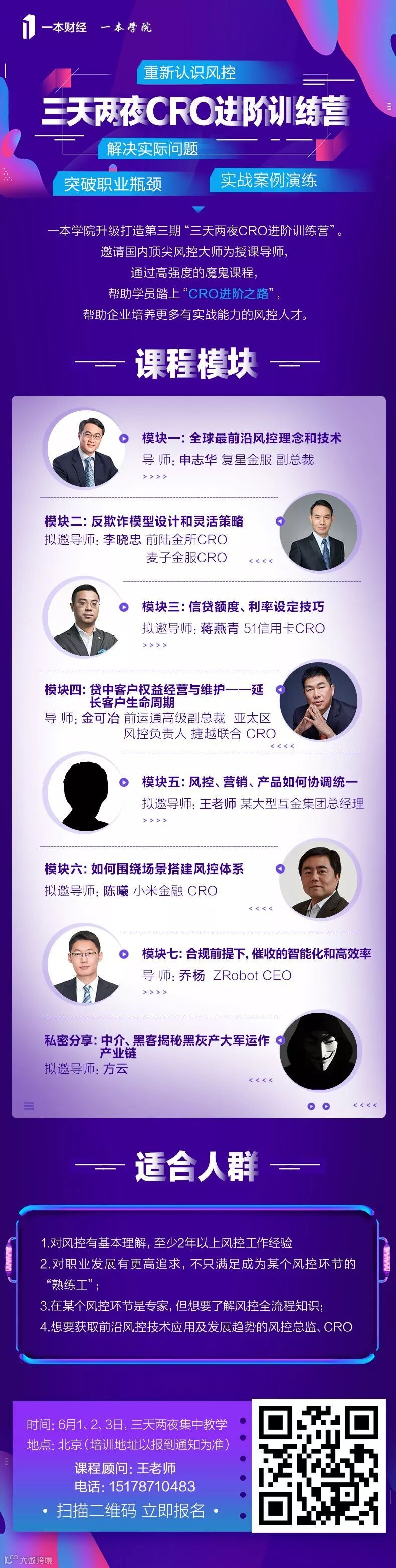第三期“三天两夜CRO进阶训练营”,邀请国内顶尖风控大师为授课导师,通过高强度的魔鬼课程,帮助学员踏上“CRO进阶之路”。