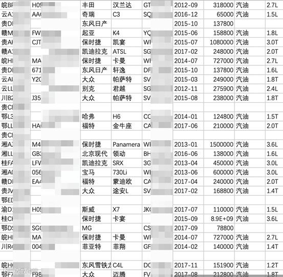 令人震惊的是,车贷用户的车辆信息,包括车型、车牌号、颜色、排量等信息,甚至两位贷款担保人的姓名、手机号,也被收录在了这份电子表格内。