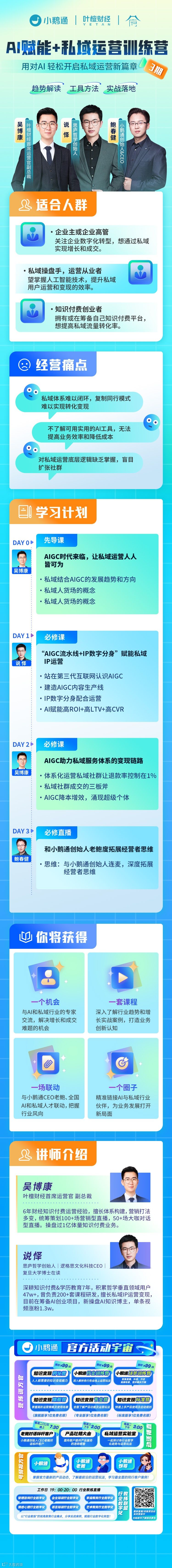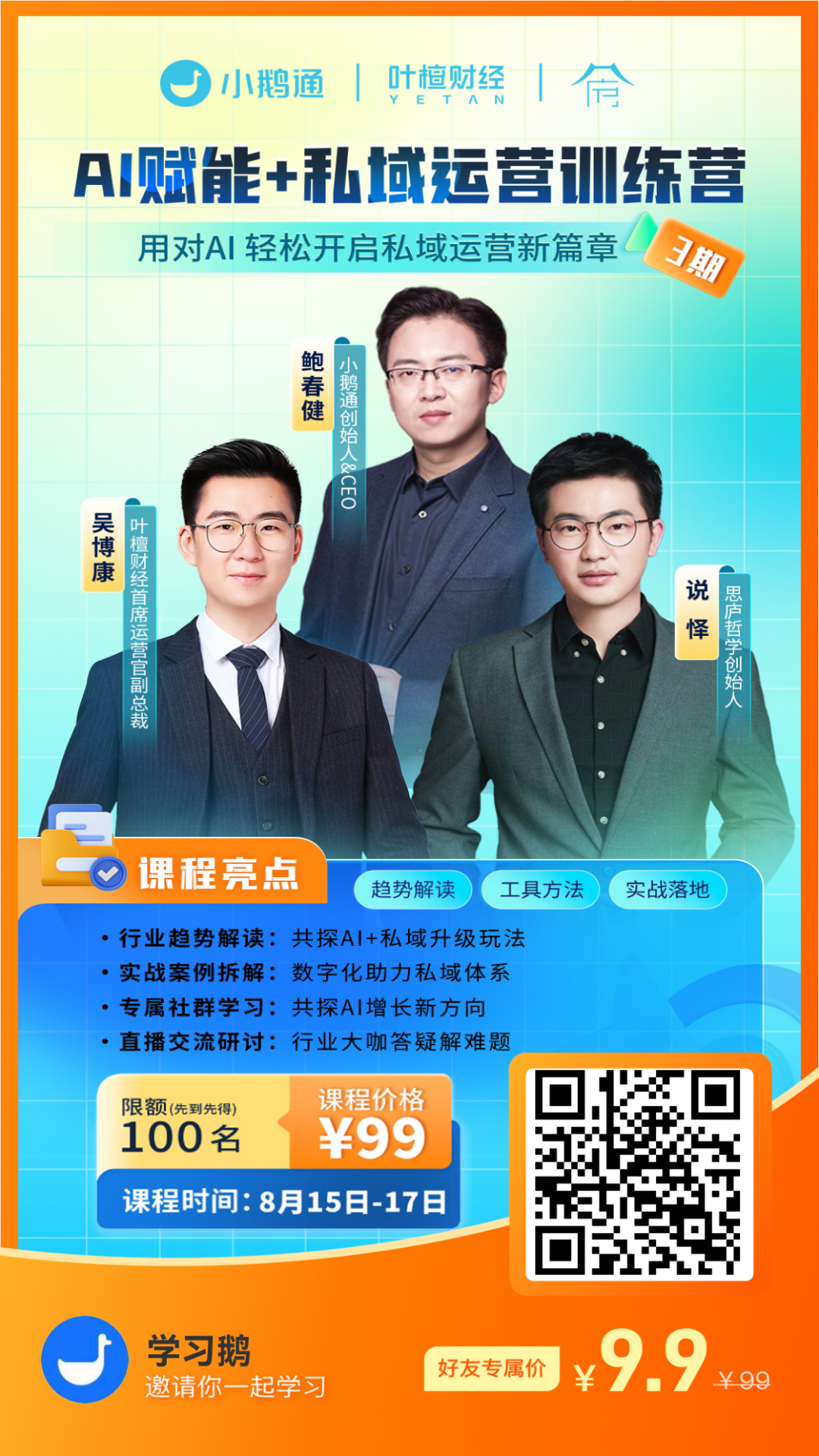 结合小鹅通众多客户的有效经验和实战案例,现在,「AI赋能+私域运营训练营」 正式火热招生中(限额100名,先到先得):