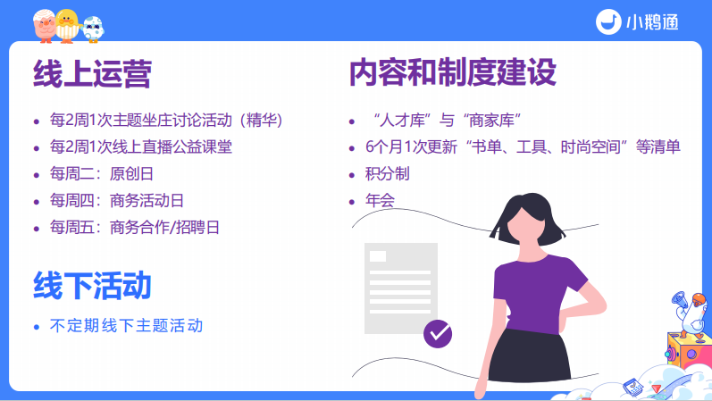 经过8年长时间的社群运营,冷芸老师还整理了一套整套透明、系统的社群运营机制,从“内容和制度建设”、“线上运营”、“线下活动”3个方向,打造出了高粘度、可持续的私域社群,搭建了自己的人才库和商家库。