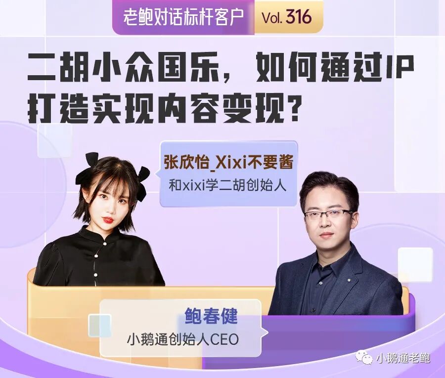 客户介绍:老鲍对话标杆第316期,邀请了和xixi学二胡创始人——张欣怡_Xixi不要酱。毕业于中央音乐学院硕士的她,是国乐大典第四季人气乐手,“和xixi学二胡”线上系列课程研发与主讲教师,全网粉丝30万+。