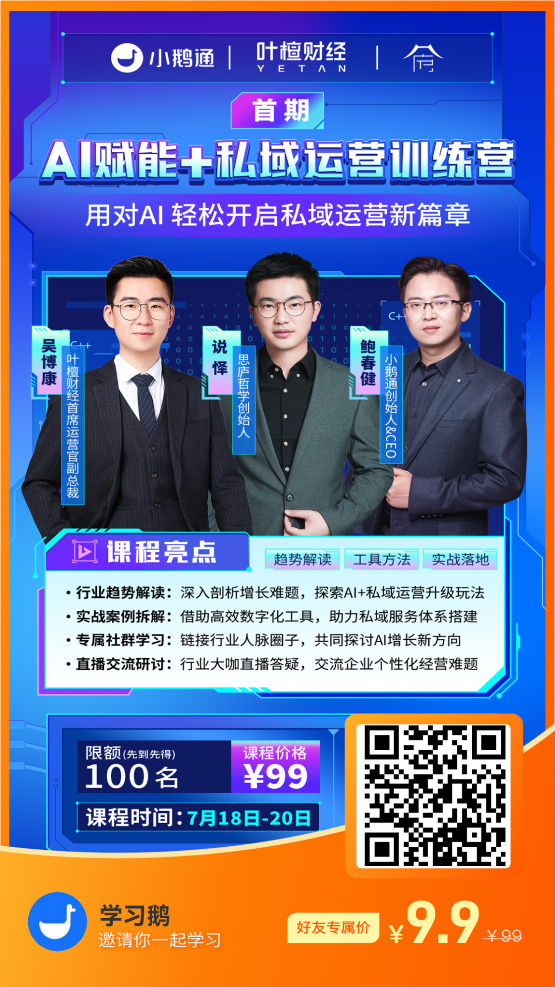 我们将邀请吴博康老师,说怿老师,还有小鹅通创始人CEO老鲍,跟大家分享关于“AI赋能+私域运营”,一起解读趋势,研习工具方法,赋能私域运营实战落地。