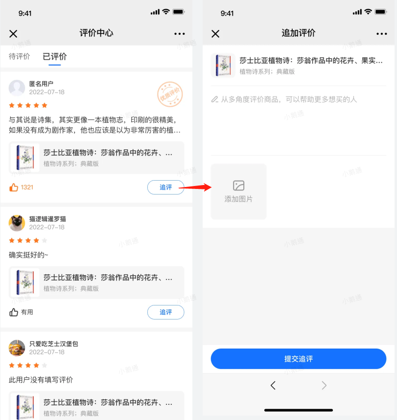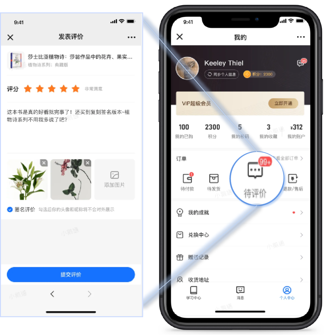 购买商品或获得课程后,学员可在「个人中心-评价中心」对课程内容发表评价。发表评价时可带图评价,图文并茂,反馈更生动哦!