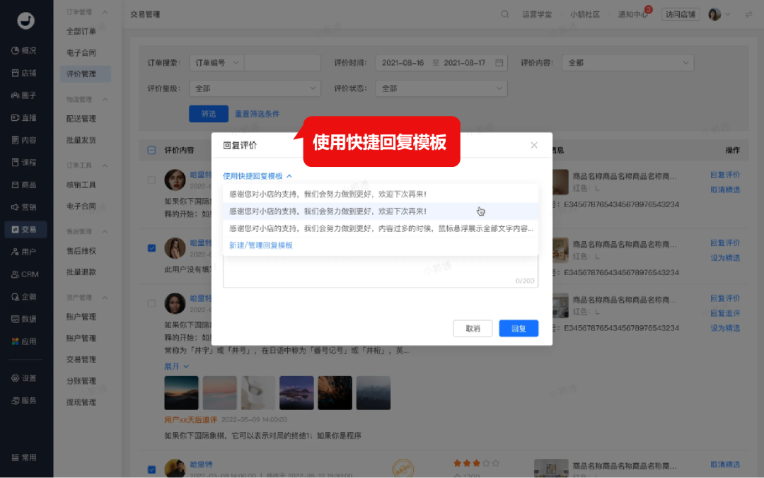 商家对主评、追评均可回复一次。进行评价回复时,可快捷选择模版进行填写回复,提高回复效率!