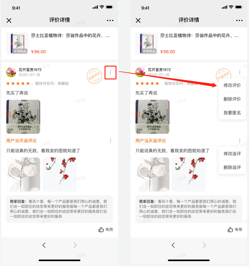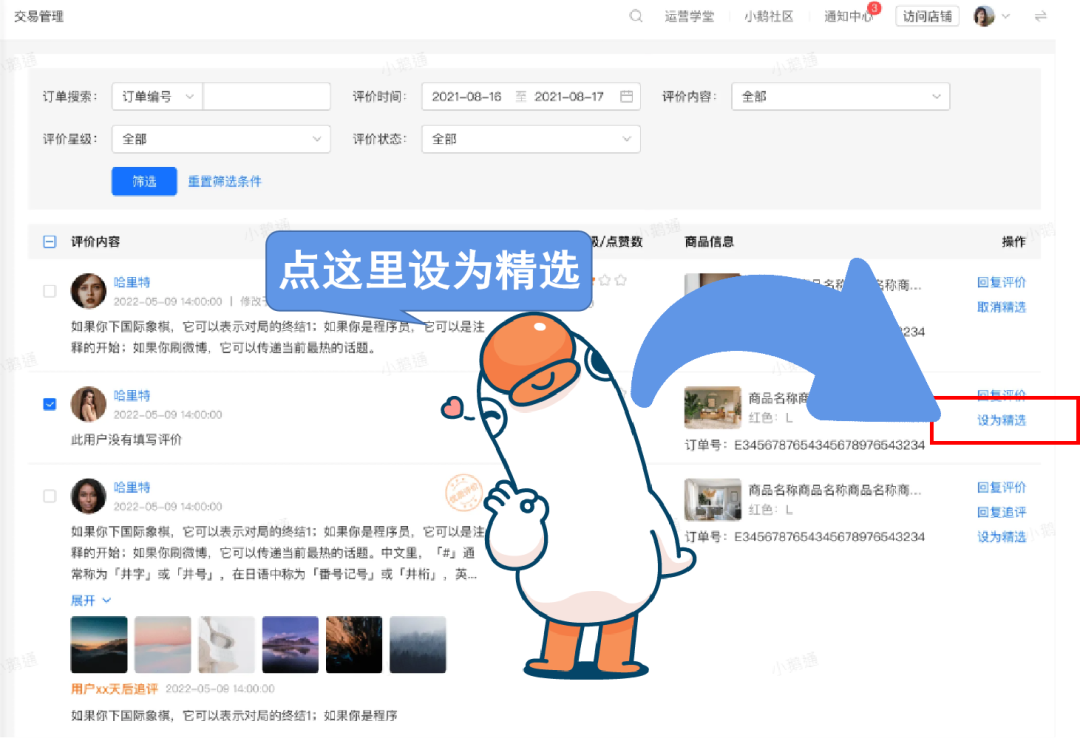 点击「设为精选」,可将用户评价设为优质评价,提高消费社区的内容质量。同时,支持批量精选、批量回复评价,管理能效大大提升!
