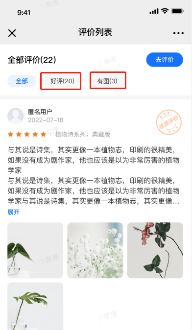 支持在评价列表只看「好评」或「有图」的评价。一键筛选,快捷方便!