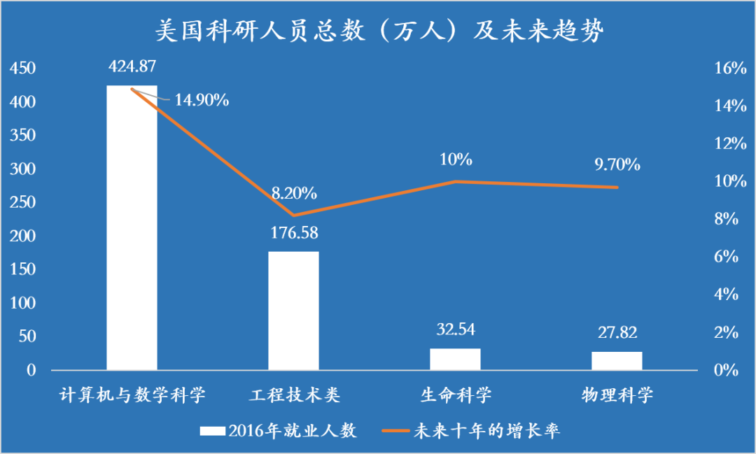 美国国家科学基金会(NSF) 2019年8月发布的《Science and Engineering Labor Force》显示,2017年全美共有676.9万人就职于科学研究和工程技术岗位,占美国就业人数的5%左右。2016年的统计数据显示:美国计算机与数学科学的科研人员有424万人,工程技术类科研人员有176万人,生命科学和物理学分别有32万人和27万人。预计到2026年,计算机与数学科学、生命科学领域的科研人员年均增长率分别为14.9%和10%。