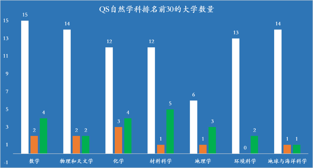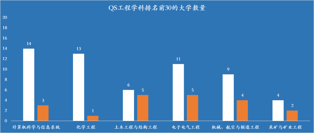 在工程技术领域,中国与美国的差距比自然科学领域要小。QS排名中的工程技术学科包括计算机科学与信息系统、化学工程、土木工程与结构工程、电子电气工程、机械航空与制造工程、采矿与矿业工程等六大类。美国在各学科上平均有9.5个高校的专业排名进入前30,中国平均有3.3个高校。在土木工程和结构工程领域,基建狂魔已经快追上美国了。这也从侧面说明,随着中国经济的发展,工程技术的提升相对基础研究是更容易的。