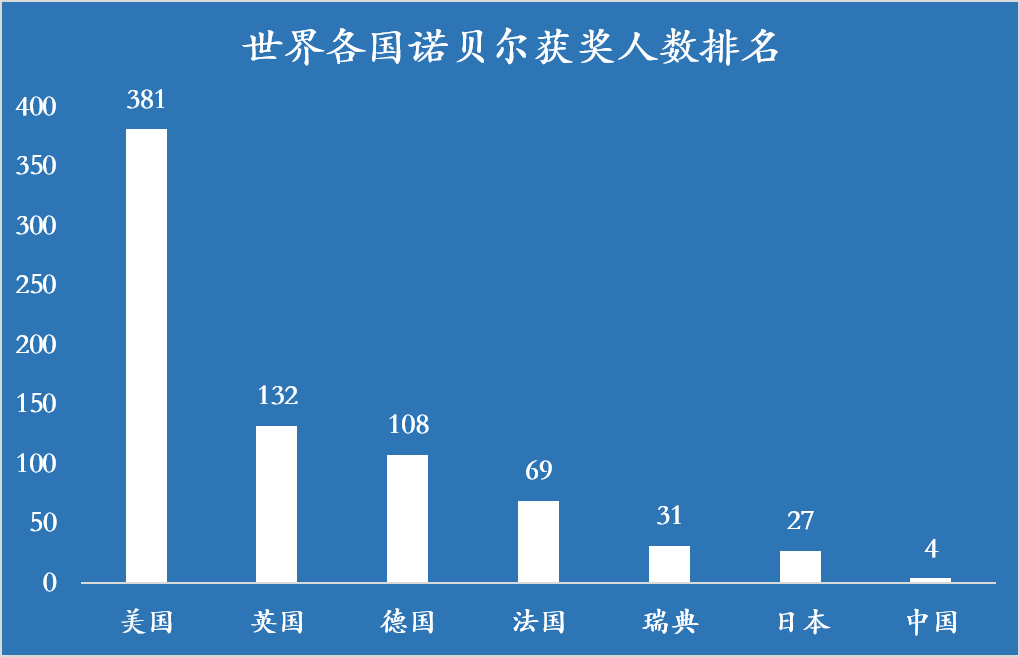 谈到中国的基础研究,总是绕不开诺贝尔奖。一个国家诺尔奖得主的总数,很大程度上反映了该国基础研究的实力。截止2019年,美国共有381人获得诺贝尔奖(不包括获奖后加入美国国籍的),比后面五国的总和还多。中国一共就4人(包括获奖后加入美国国籍的):2012年诺贝尔文学奖得主莫言,2015年生理学奖和医学奖得主屠呦呦,以及1957年诺贝尔物理学奖得主李政道和杨振宁(当时是中国台湾藉)。关于诺贝尔奖,我们不仅羡慕美国的规模,还嫉妒日本的速度。2019年的诺贝尔化学奖颁给了美国科学家斯坦利·惠廷厄姆、约翰·古德伊纳夫及日本科学家吉野彰。至此,日本在20世纪的第19年里获得了第19个诺贝尔奖,平均1年1个。在2000年之前,日本历史上一共只获得过9个诺贝尔奖。早在2001年,日本就提出了“50年30个诺贝尔奖”的计划,仅仅只过了不到20年,他们已经拿了19个诺贝尔奖,而且这19个诺贝尔无一不是含金量最高的科学类奖。