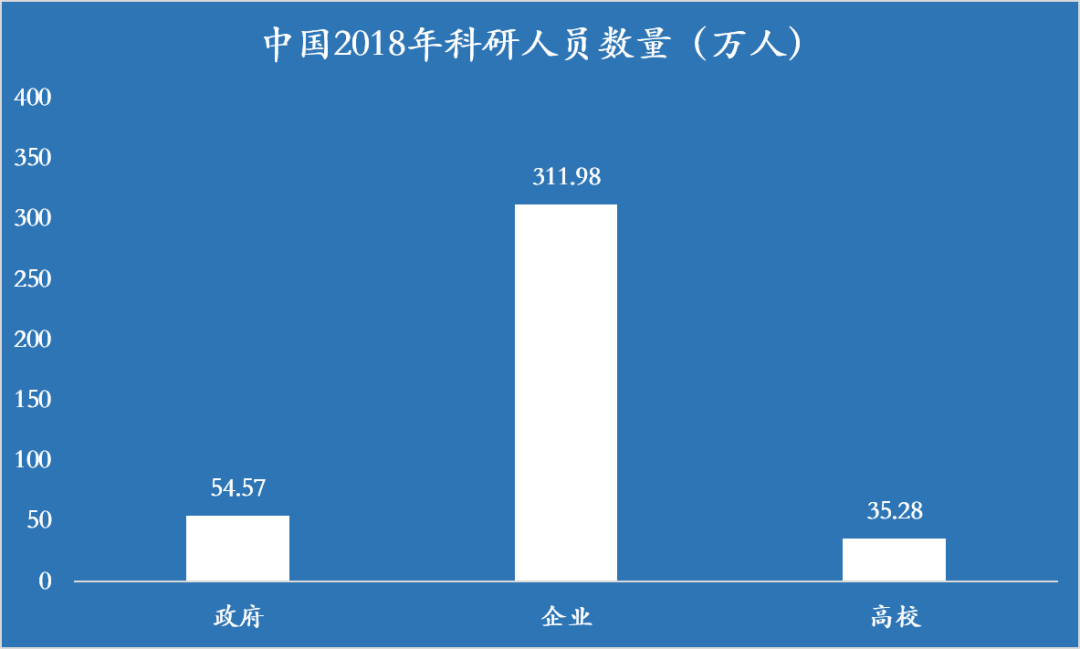 世界银行数据显示,中国2018年有科研人员401万,其中政府科研人员54万,高校科研人员35万,企业科研人员311万。相同口径下,美国的企业科研人员为147万。此外,根据中国国家统计局报告,2019年我国研究生教育招生91.7万人,在学研究生286.4万人,毕业生64万人。普通本专科招生914.9万人,在校生3031.5万人,毕业生758.5万人。