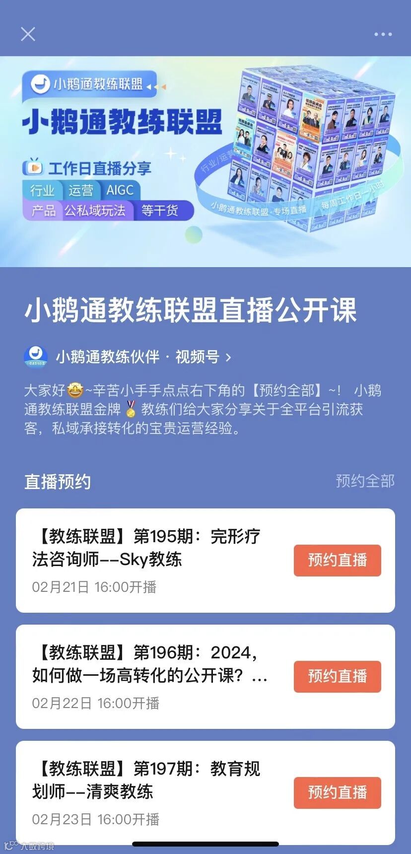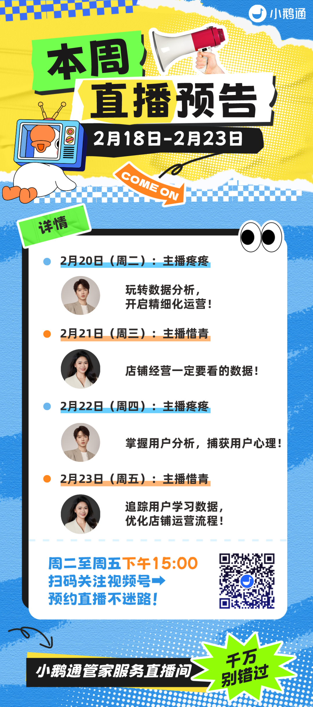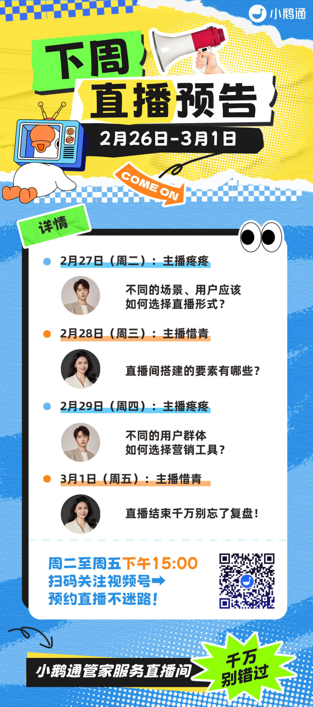 记得提前预约上方所有直播,到点冲直播拿一波大礼。后续还想了解哪些精彩直播动态和运营干货?评论区告诉鹅~