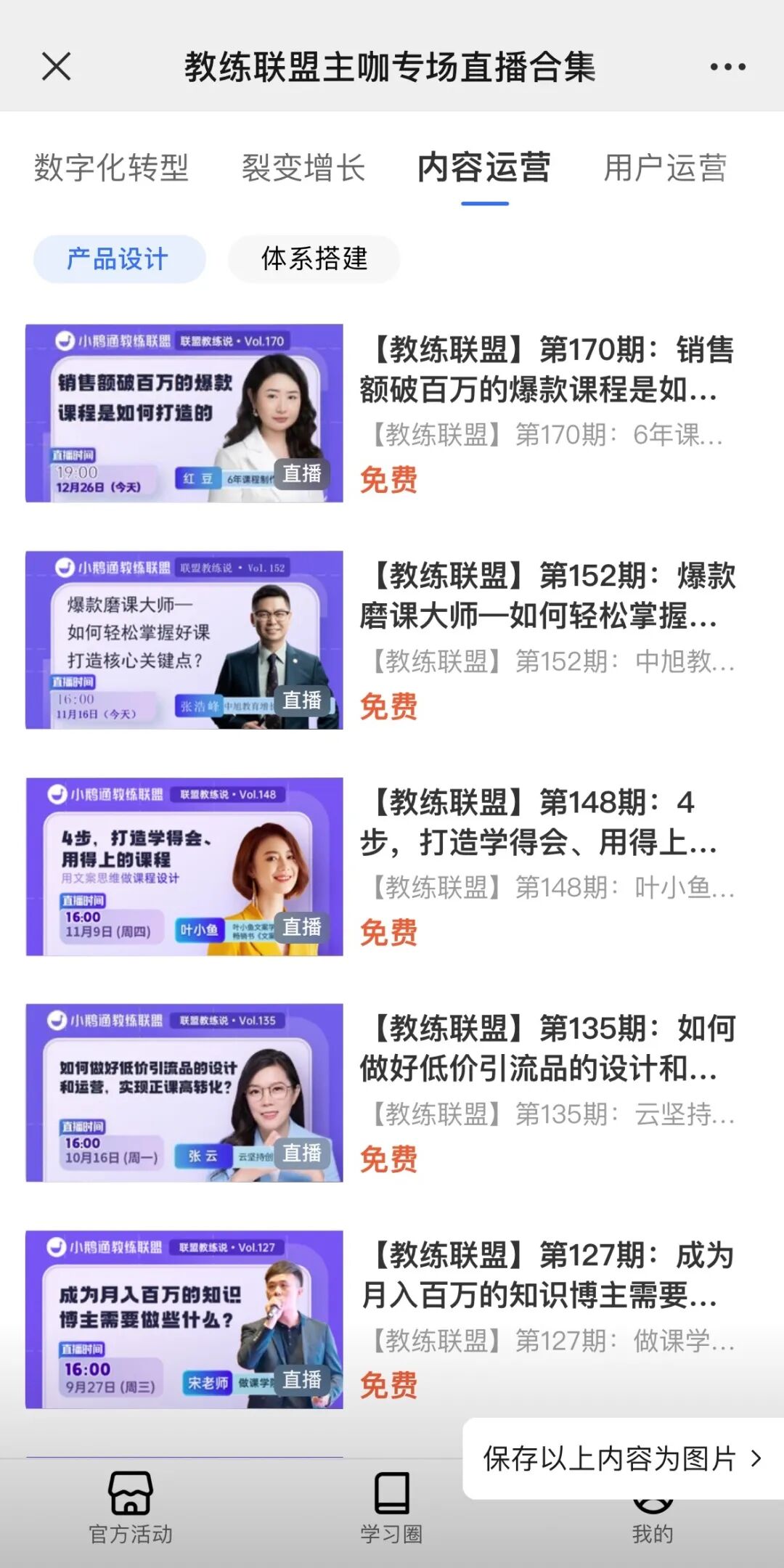 因此我们联合推出了一系列的教练专场直播、月度公开课直播、每周私域诊断室直播等重量级直播动,每周工作日不间断,涵盖了数字化转型、用户运营、内容运营、裂变增长等深度话题,从行业趋势、产品研发、公私域运营玩法等方向,不断地为创业的伙伴们输出系统的运营方法论和落地经验。