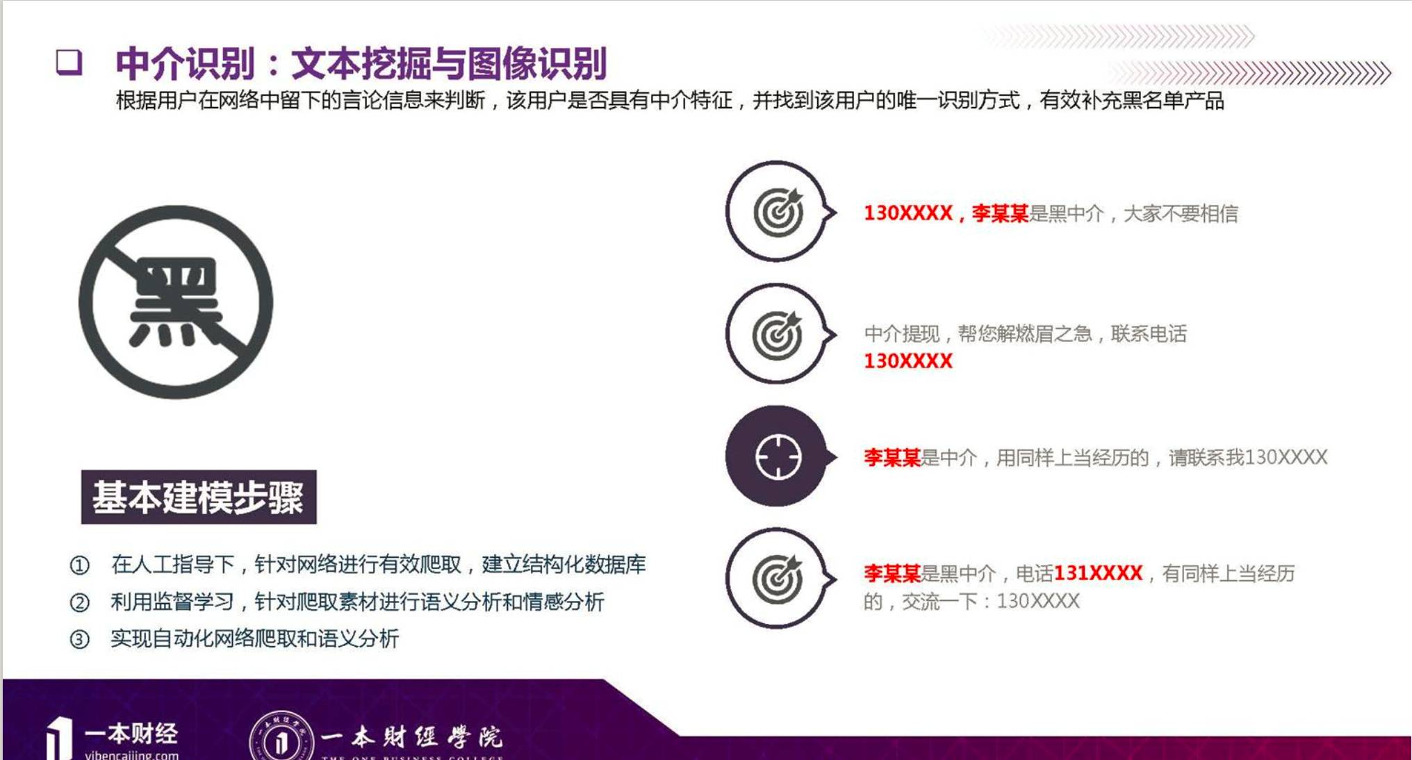 第三,是中介识别,就是根据用户在网络中留下的言论信息,来判断该用户是否具有中介特征,这是对黑名单模型的补充。