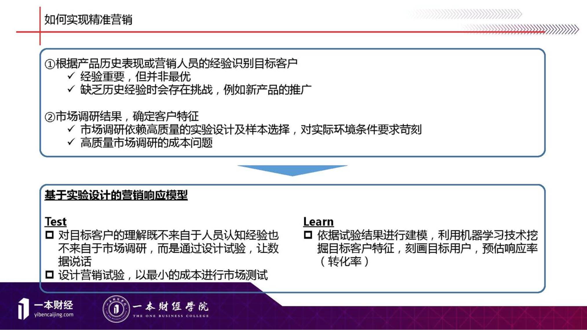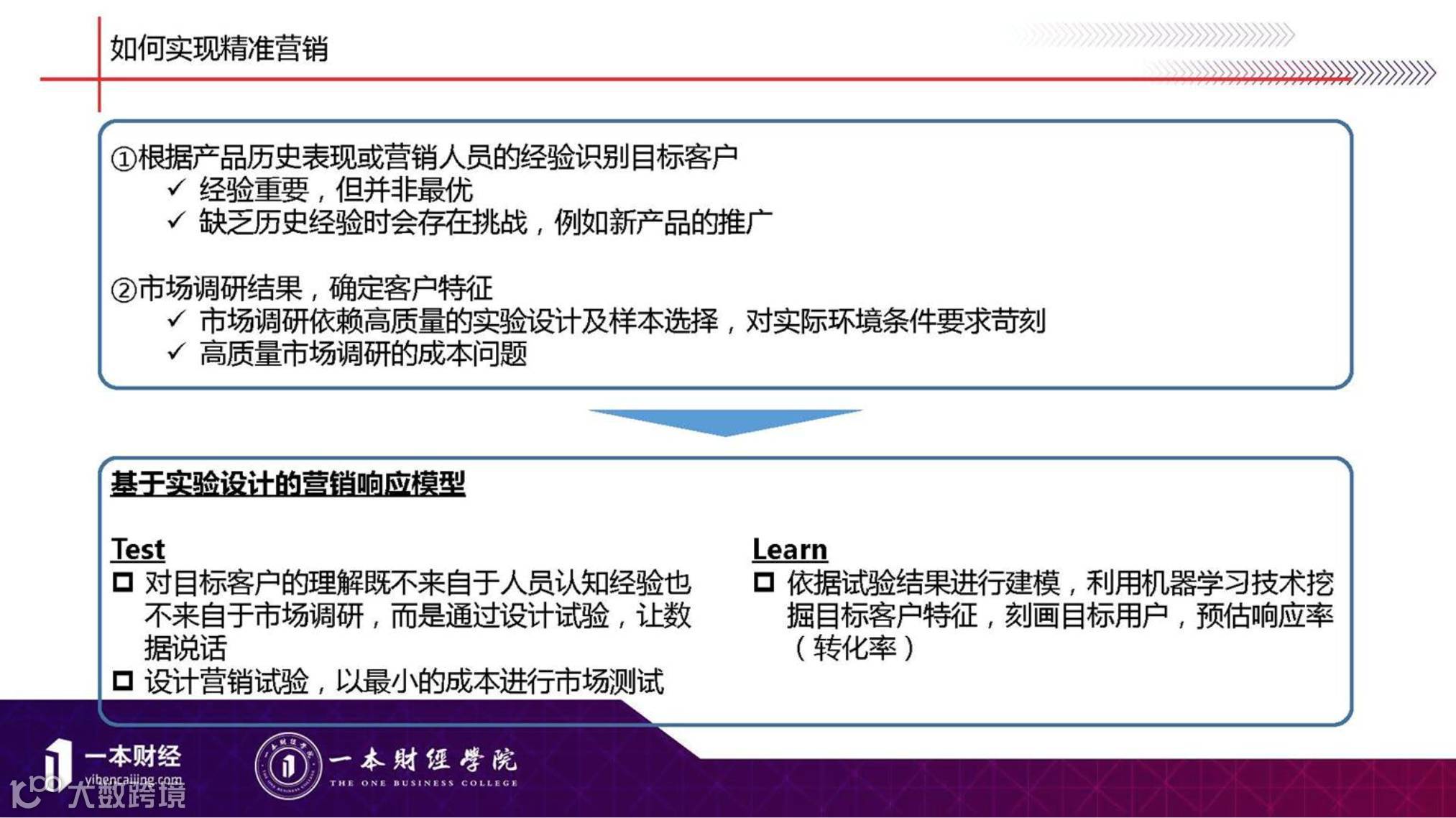 我们是提倡“test&learn”的方式,就是你对目标客群的理解,不基于你的营销人员,他完全是通过我们实验设计,通过我们的数据来说话,那通过,营销实验的方式,你最小的成本来测试,那么最终你可以通过你测试到的基本数据来建模,来准确判断用户的一个画像,可以精准预估转化率。