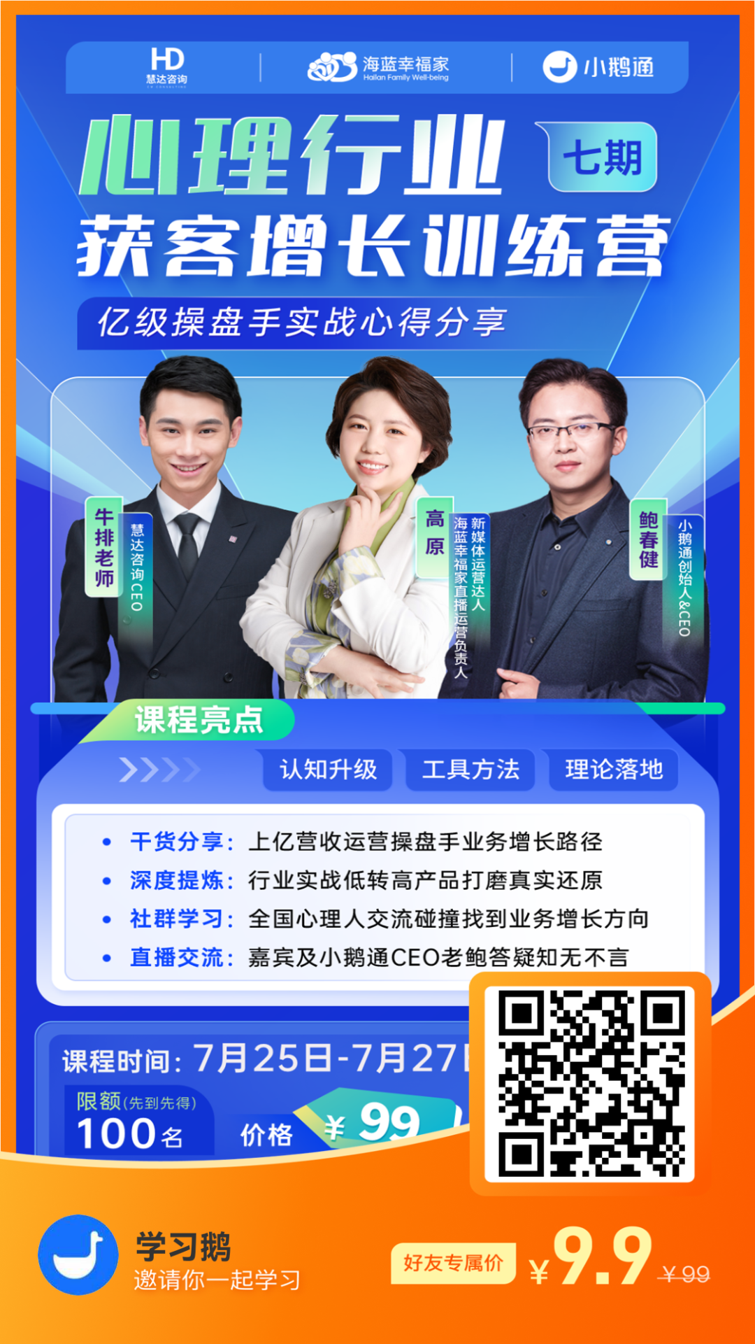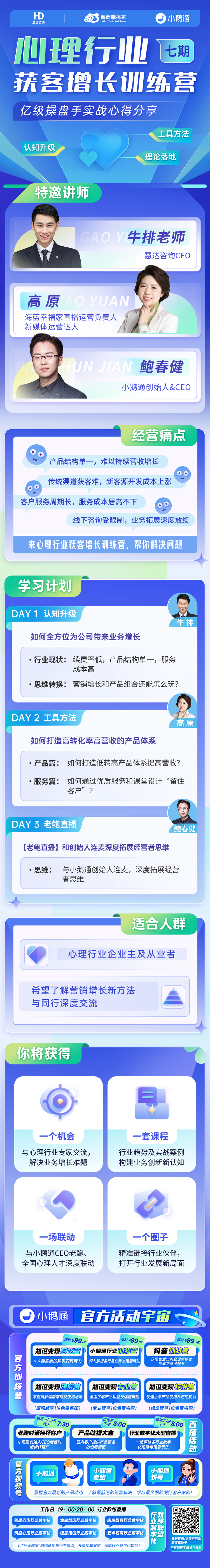 结合小鹅通许多优秀的心理行业客户案例,还有数十位心理行业头部IP的访谈,这回,我们特别定制「心理行业获客增长训练营」。