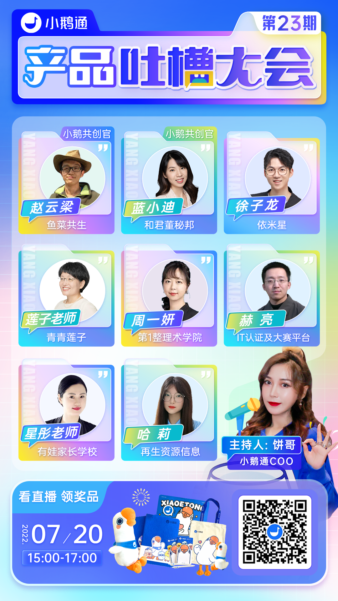 除了吐槽嘉宾以外,本期直播「小鹅共创官」也将持续在线!用第三方视角参与产品群聊,多视角讨论产品,期待深度交流中出现不一样的产品优化方向!