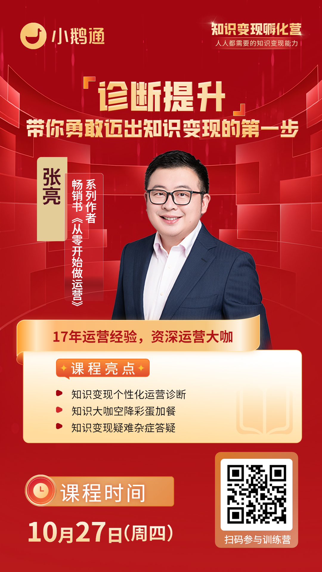 第三天,小鹅通特邀17年运营经验以及全网火爆《从零开始做运营》系列畅销书作者张亮老师重磅参与,进行专属的直播作业点评,通过诊断带你迈出知识变现的第一步。