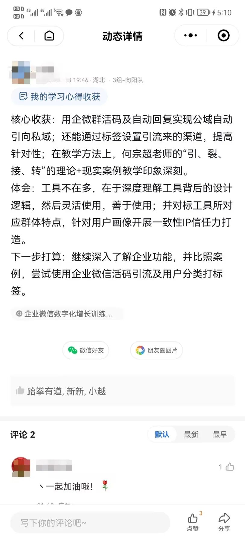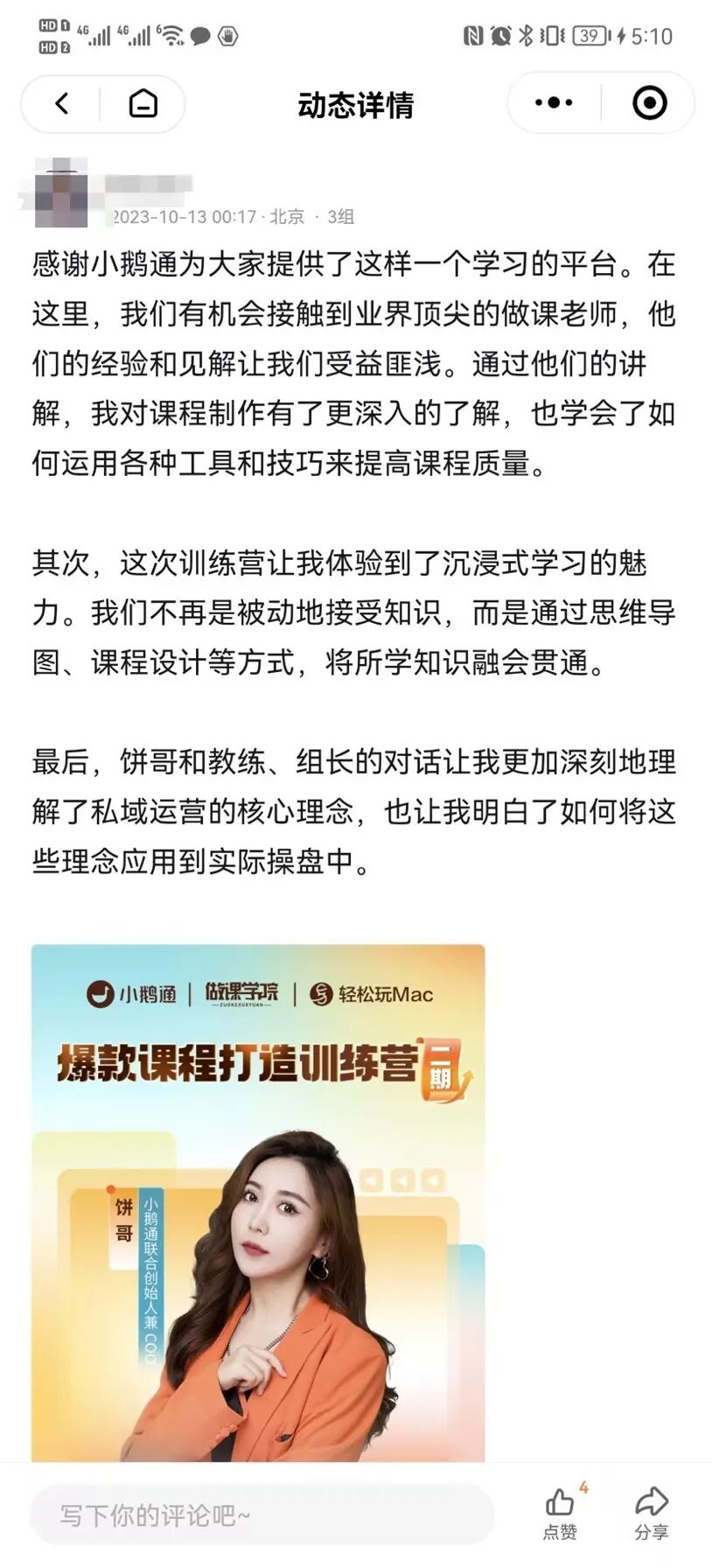 还有的教练代表,作为训练营讲师讲授课程,分享自己多年来的运营方法论和实战经验,带给训练营学员不少启发,获得了小鹅通训练营学员的一致好评。