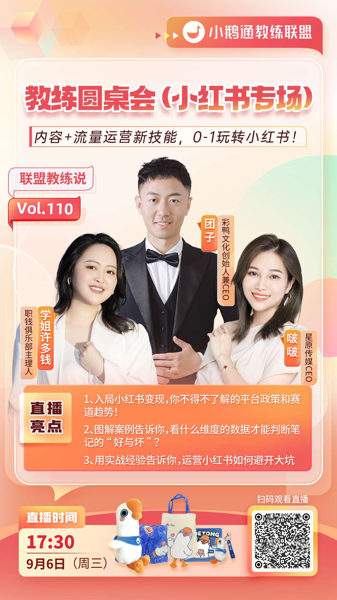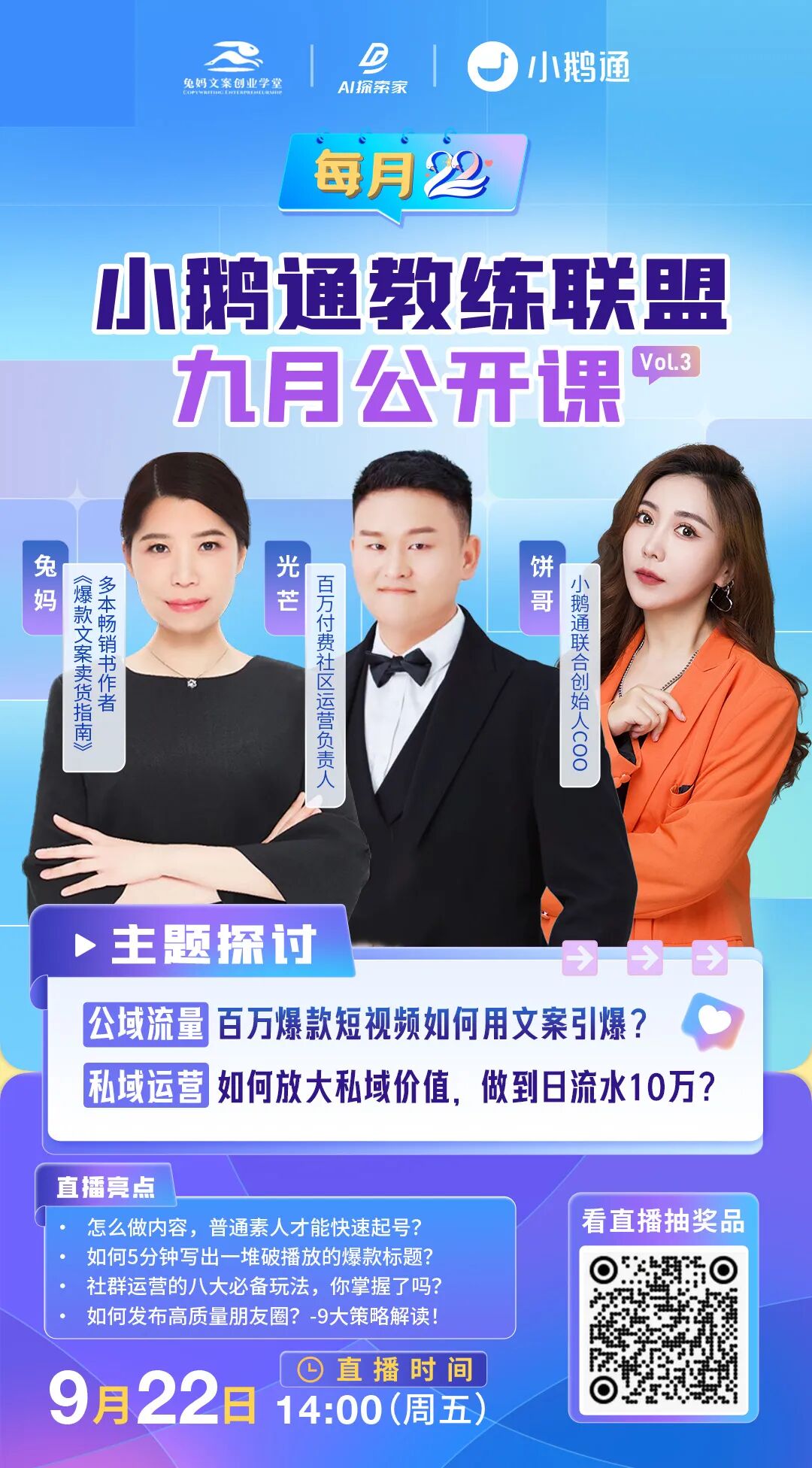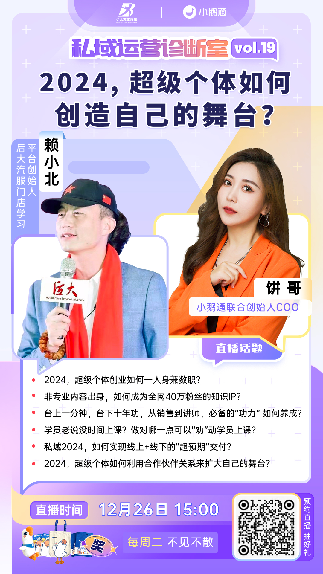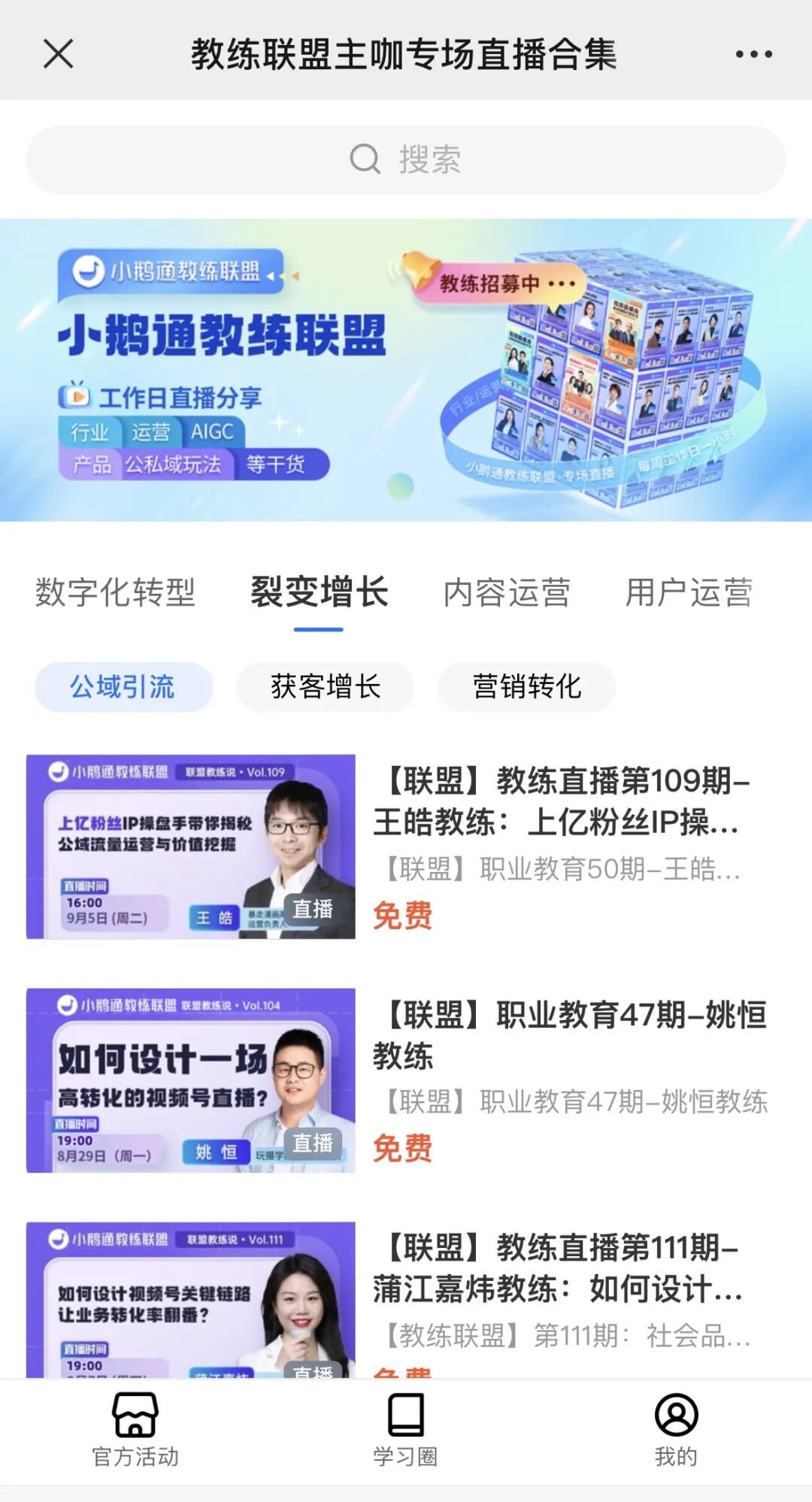 为了帮助更多商家找到业务增长的新方向,我们邀请教练们担任小鹅通官方直播活动的栏目嘉宾,出席月度公开课直播、每周私域诊断室直播等重量级活动,直接对话小鹅通COO饼哥,从经营者的角度,找寻业务增长思路。