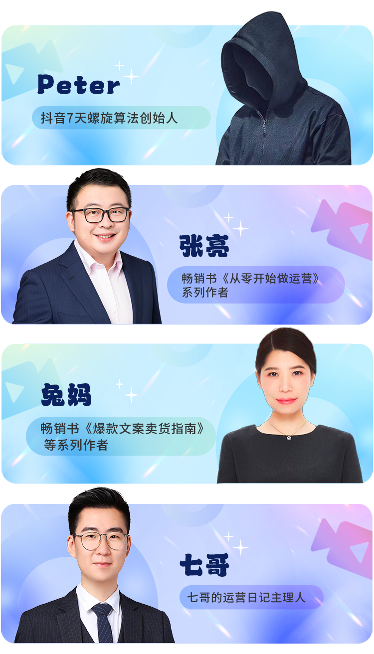 比如,17年运营经验《从零开始做运营》的作家&资深运营大咖张亮、抖品牌流量研究院首席导师Peter、操盘过1亿体量知识付费业务的七哥、京东和当当新书热销榜TOP1《爆款文案卖货指南》作者兔妈等等,都是非常出色的教练代表。