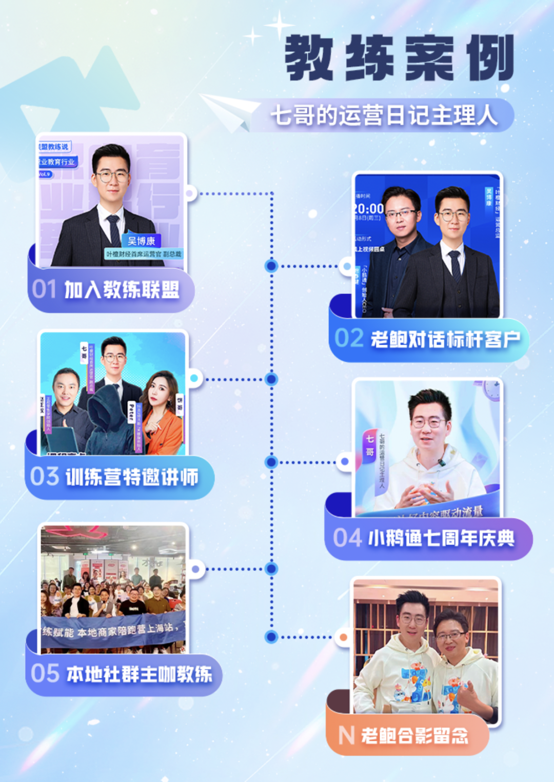 这一年来,教练们、广大创业的朋友们和小鹅通一起创造了太多惊喜。教练代表们也在不断地解锁新的项目和角色。例如我们的教练代表七哥,加入教练联盟后,和小鹅通帮助广大的创业的朋友们,解锁了许多新的可能,抵达了一站又一站: