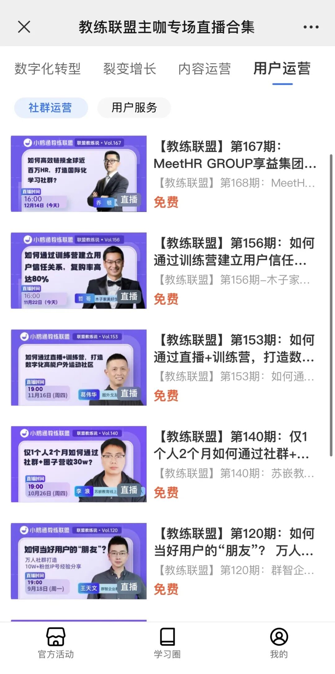 这一系列的教练专场直播,每周工作日不间断,涵盖了数字化转型、用户运营、内容运营、裂变增长等4大方向的深度话题,从行业趋势、产品研发、公私域运营玩法等方向,不断地为创业的伙伴们输出系统的运营方法论和落地经验。