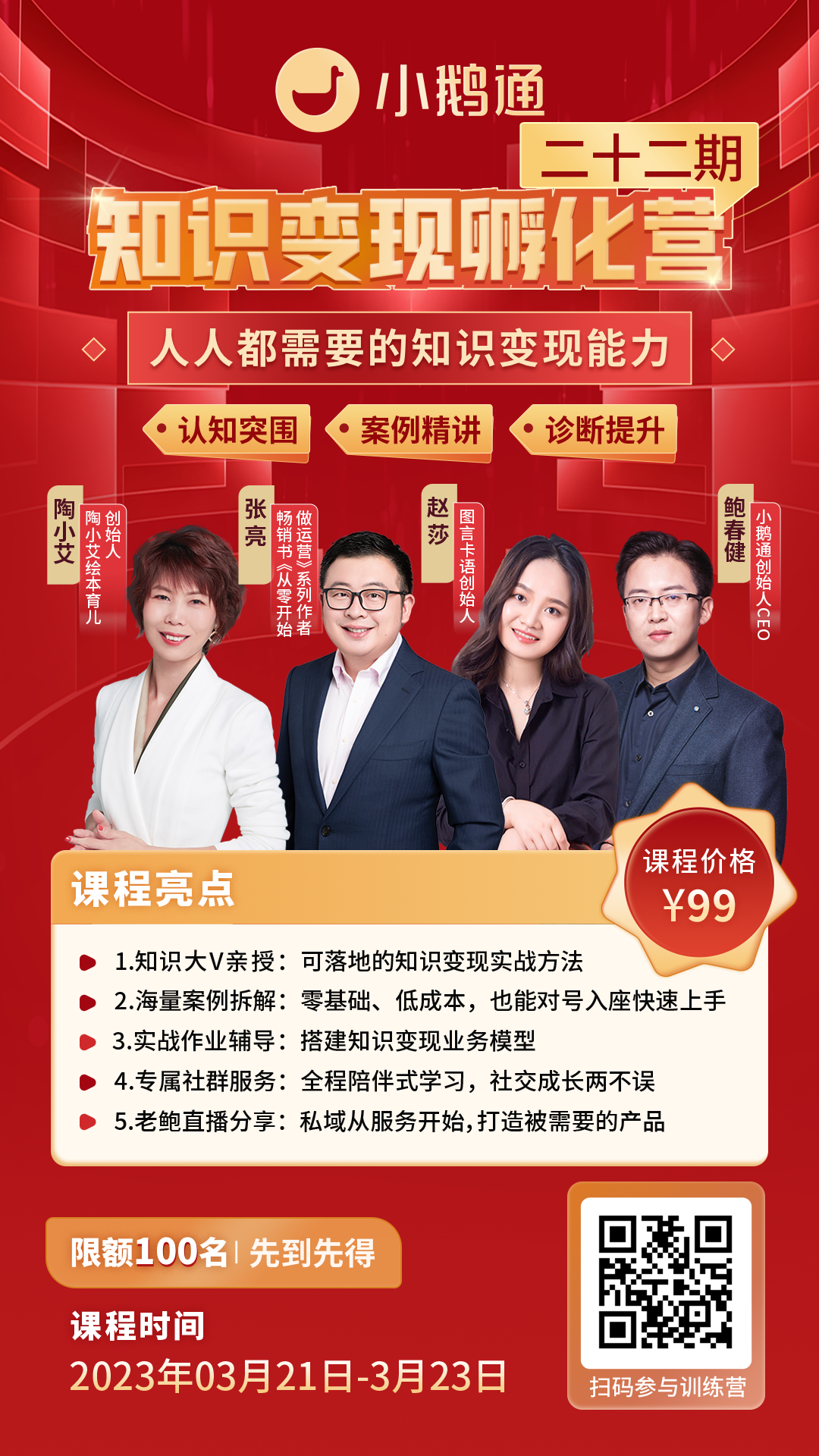 知识变现孵化营第22期正式火热招生中,每期限额100名,先到先得: