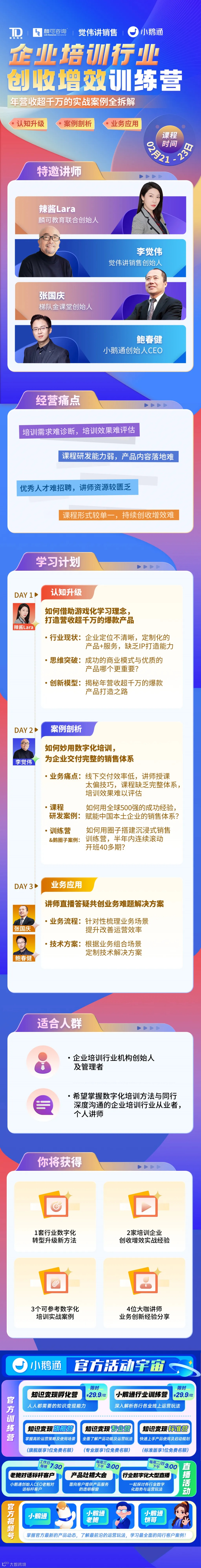 我们结合小鹅通许多优秀的企业培训行业客户案例,还有多名头部IP访谈调研,特别定制了「企业培训行业创收增效训练营」。