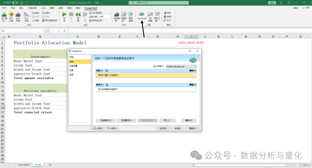 1、目标:这里我们选择最大化投资组合的收益。也可以设置要求,比如说让标准差偏小来降低个人的风险。