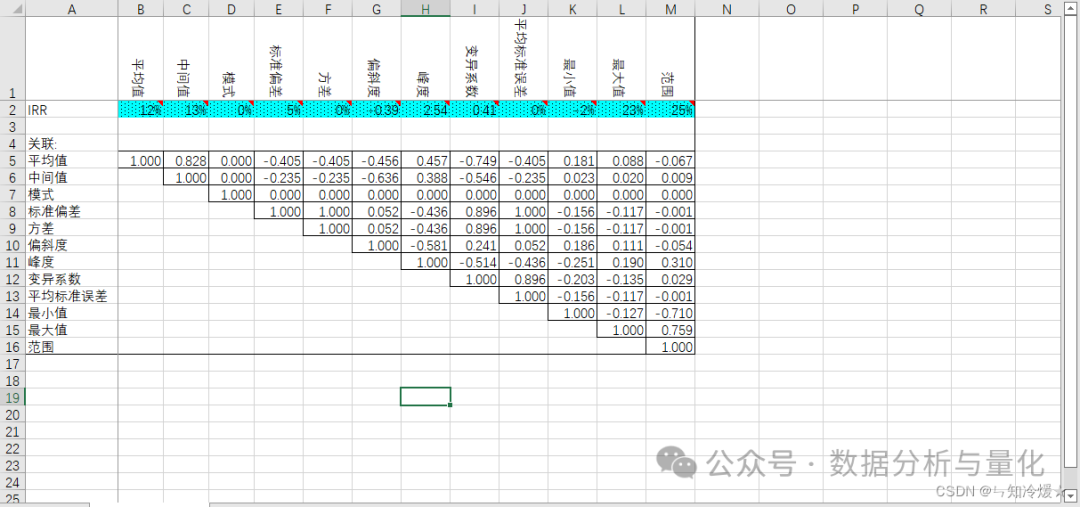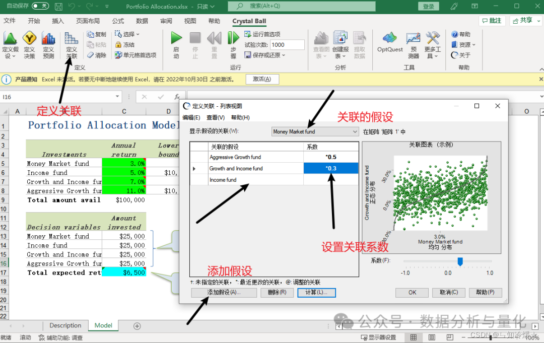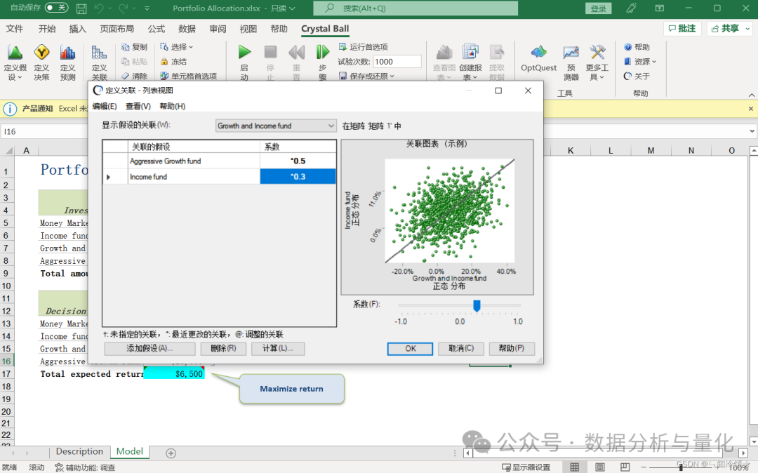 假设:在本例中,假设知道增长(Growth and income fund)与收入基金(Income fund)和积极增长基金(Aggressive Growth fund)具有一些共同的市场影响,并且它们具有正相关关系(0.5)。在这两种假设中,都可以通过选择对话框右下方的correlation按钮来定义相关性。定义一些系数之后,我们可以在右边的小图中看到相关性关系图。