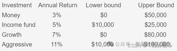 基础案例:一个投资者有10万美元可以投资于四种资产。这个问题的不确定性来源是每种资产的年回报率。较保守的资产具有相对稳定的年收益,而最不保守的资产具有较高的波动性。决策问题是确定在每种资产上投资多少,以使总预期年收益最大化,同时将风险保持在可接受的水平,并保持在每种投资的最小和最大限度内。