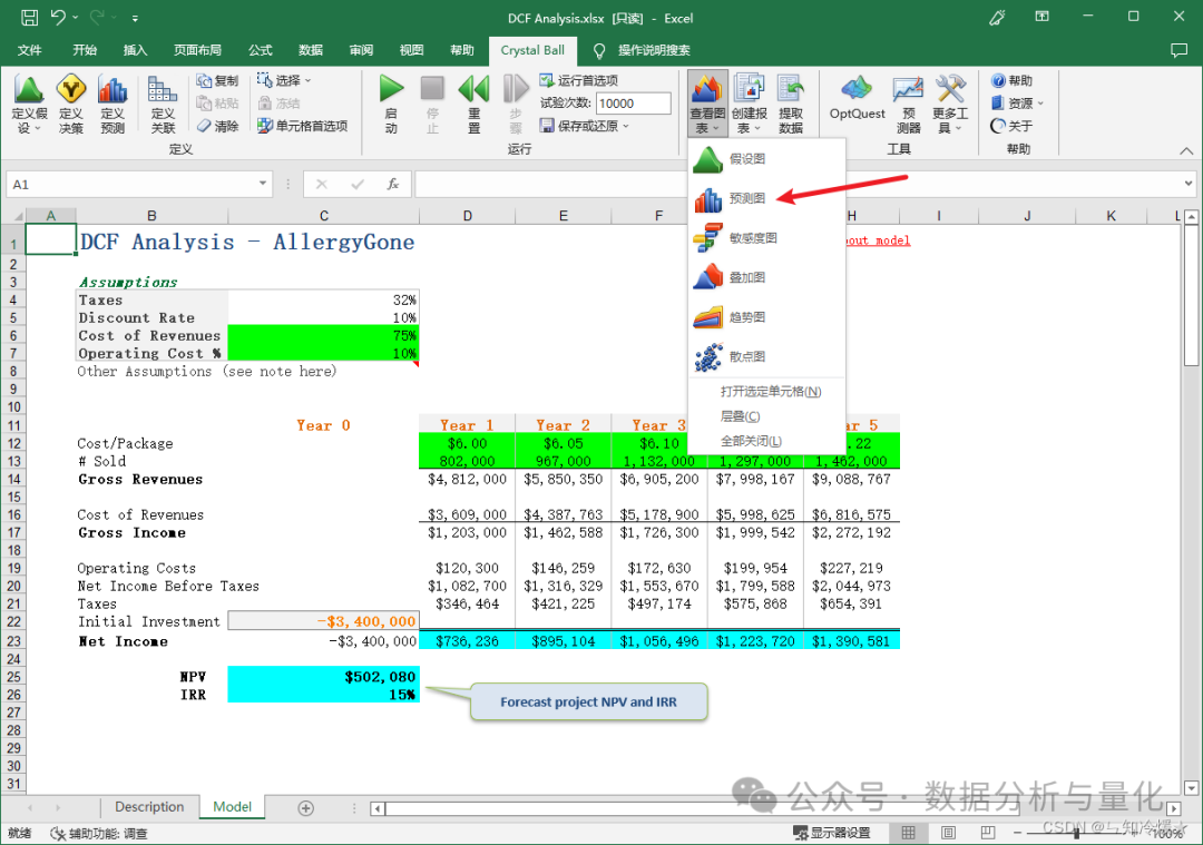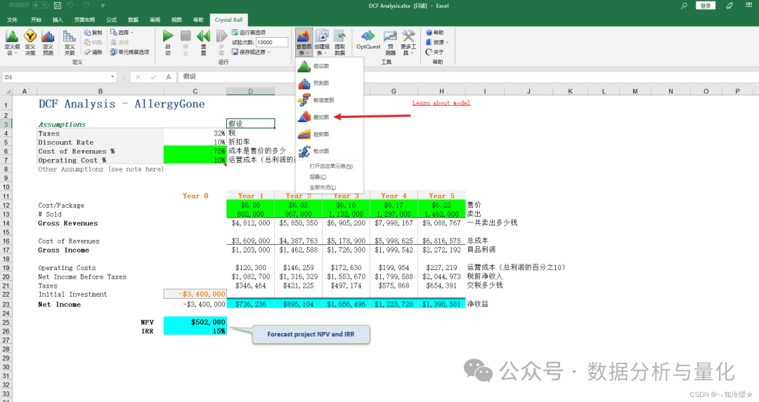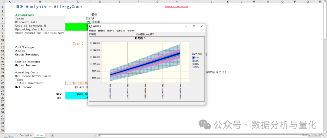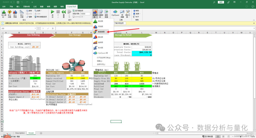敏感度图用来看一个给定的假设对结果有多大的影响,换句话说,你要确定预测对每个假设的敏感性。敏感度图表使您能够快速、轻松地判断每个假设单元对特定预测单元的影响。