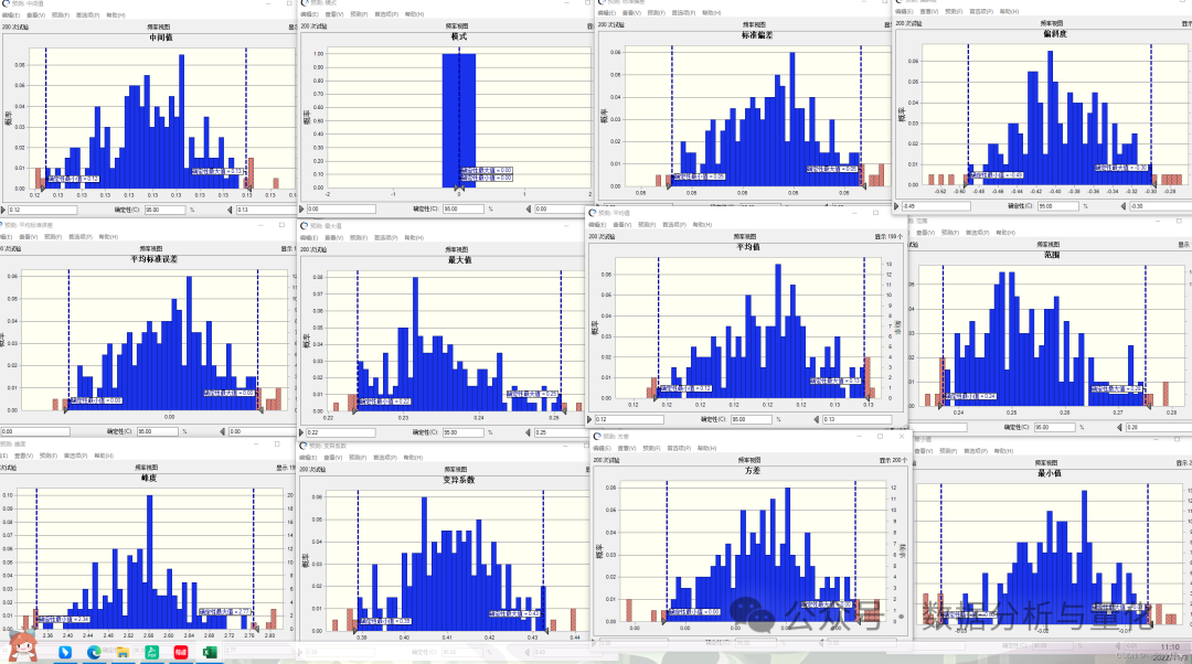 5、运行结果,分析输出:Bootstrap工具在预测图表中显示均值、中位数、标准差、方差、偏度、峰度和变异统计系数的抽样分布。预测图表直观地显示了每个统计数据的准确性。窄而对称的分布通常比宽而倾斜的分布好,因为紧凑的分布意味着大多数值都集中在抽样分布的平均值,或统计量的近似“真实”值周围。