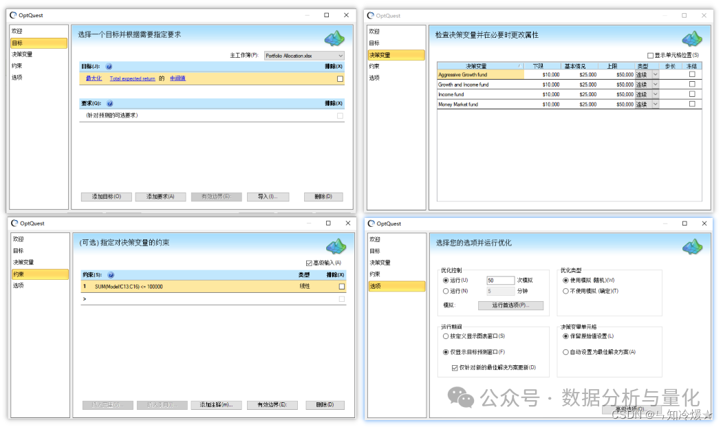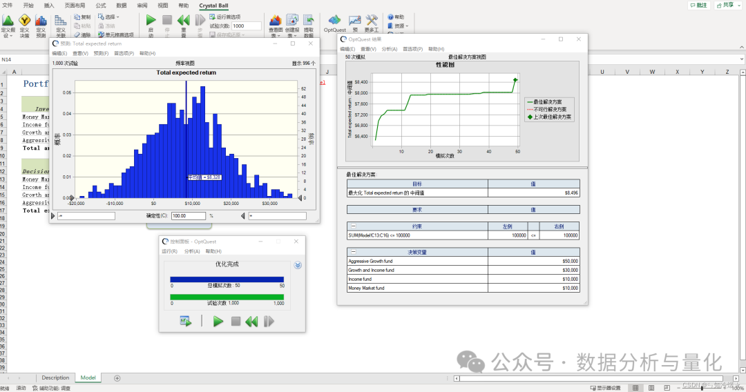 优化过程:OptQuest为每个决策变量选择一个值,将这些值输入到您的在excel表格上运行蒙特卡洛模拟,记录结果,并重复。在运行解决方案时,OptQuest还检查是否符合约束和要求。此外,OptQuest应用自适应和神经网络技术来帮助它从过去的优化中学习,这样可以在更短的时间内获得更好的结果。