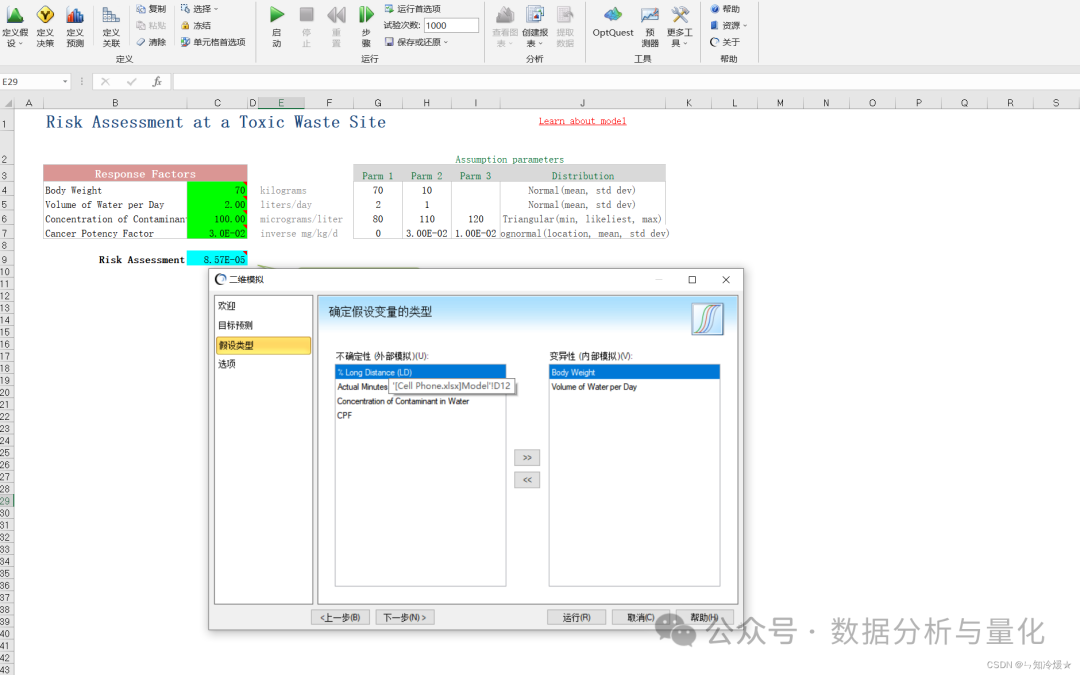 使用:选择更多工具中的二维模拟,在假设类型这里将假设变量分为不确定性变量和变异性(可变性)变量。