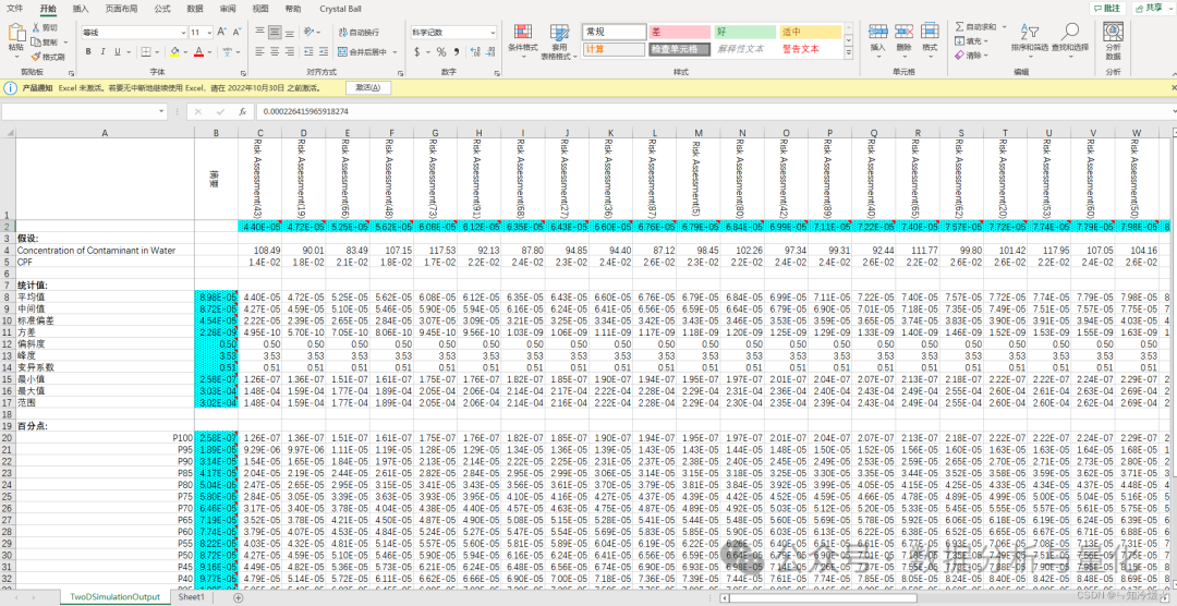 结果:在完成模拟之后,该工具将创建一个包含2D模拟结果的单独工作簿。模拟结果显示在一个表格中,表格中包含每个模拟的预测均值、不确定性假设值和预测分布的统计数据(包括百分位数)。